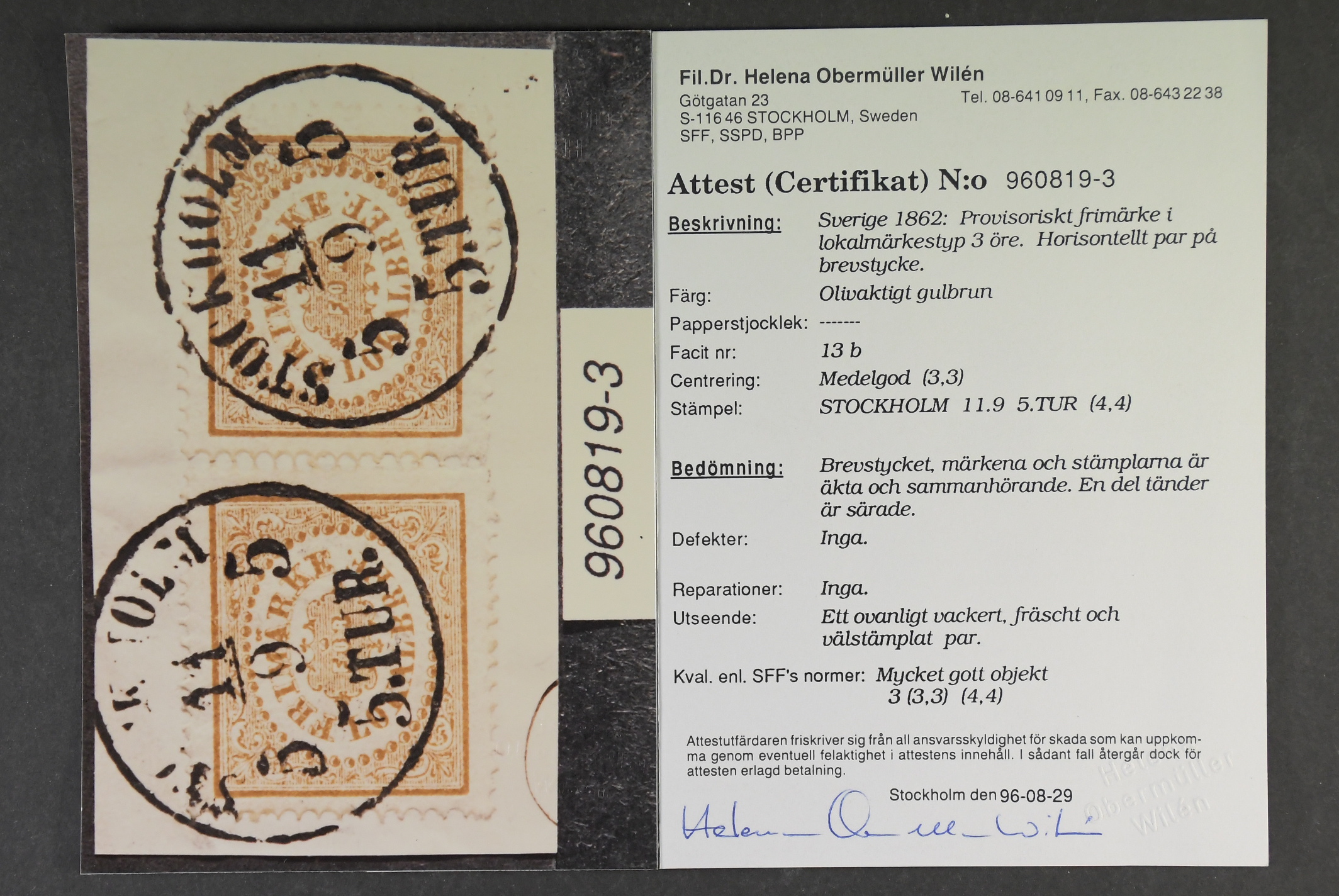 Sweden. Facit 13b on piece, 3 öre olivish yellow-brown. PAIR (some perfs separated) on cut piece cancelled STOCKHOLM 5.TUR 11.9. Certificate HOW 3 (3,3) (4,4) (1996). SEK 12000