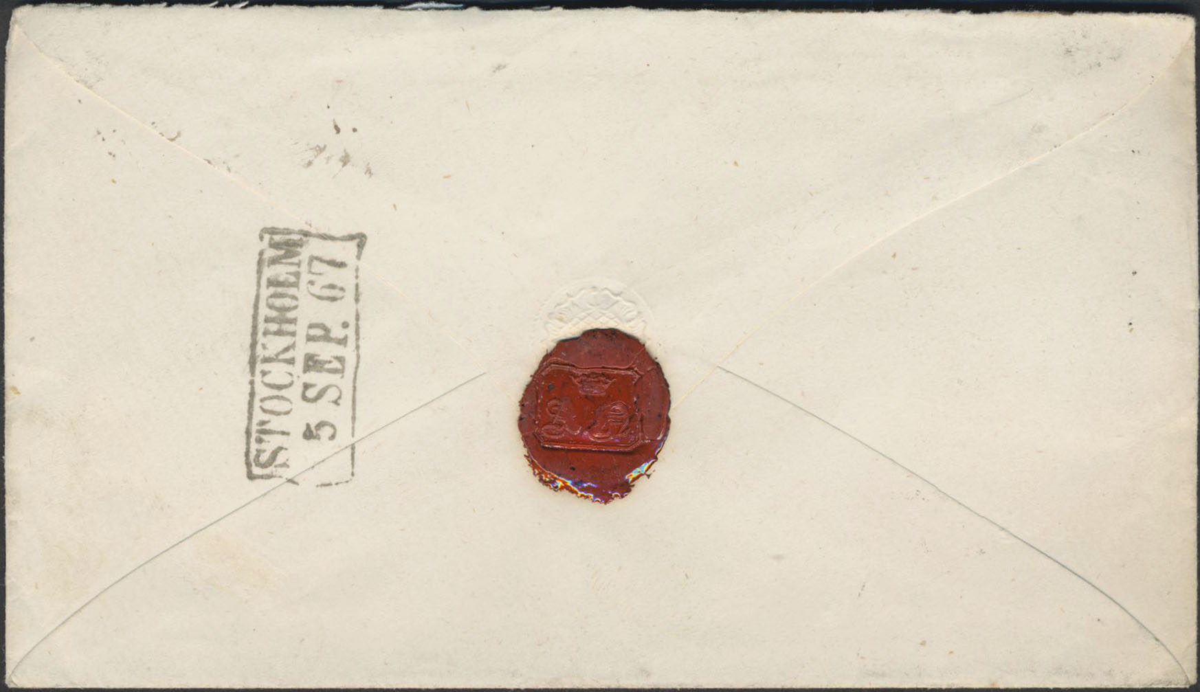 Sweden. Facit 11d2 on cover, 30 öre dark brown, perforation of 1865. Pair on cover to 'Otto Nordenskiöld Träskända Järnvägsstation, Frugård, Helsingfors, Finland'. Canc. NYKÖPING 5.9.1867, STOCKHOLM 5 SEP.67 AND ANK 8 9. Superb quality.