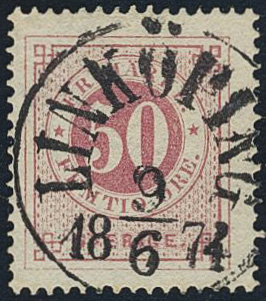 Sweden. Facit 26 used, 50 öre red. EXCELLENT cancellation LINKÖPING 9.6.1874. One slightly short perf.