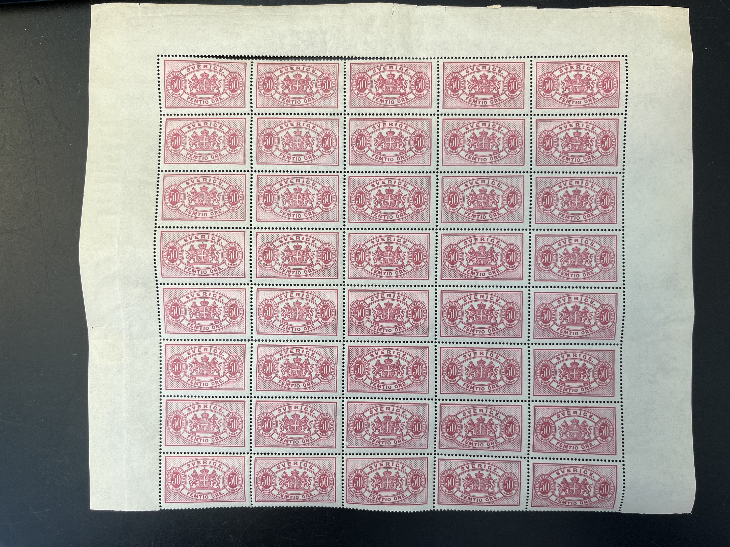 Sweden. Official Facit Tj22B ★★, 50 öre red, perf 13, type II. Somewhat separated perforations in block of 40. Superb quality. Ex. Contenta. SEK 160000