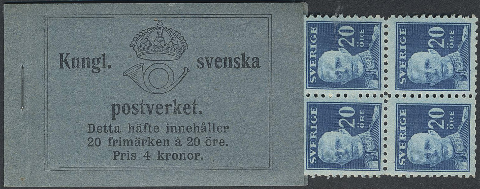 Sweden. Booklet Facit H14, 1920 Gustaf V full face 20 × 20 öre blue with KPV. Excellent quality. SEK 14000