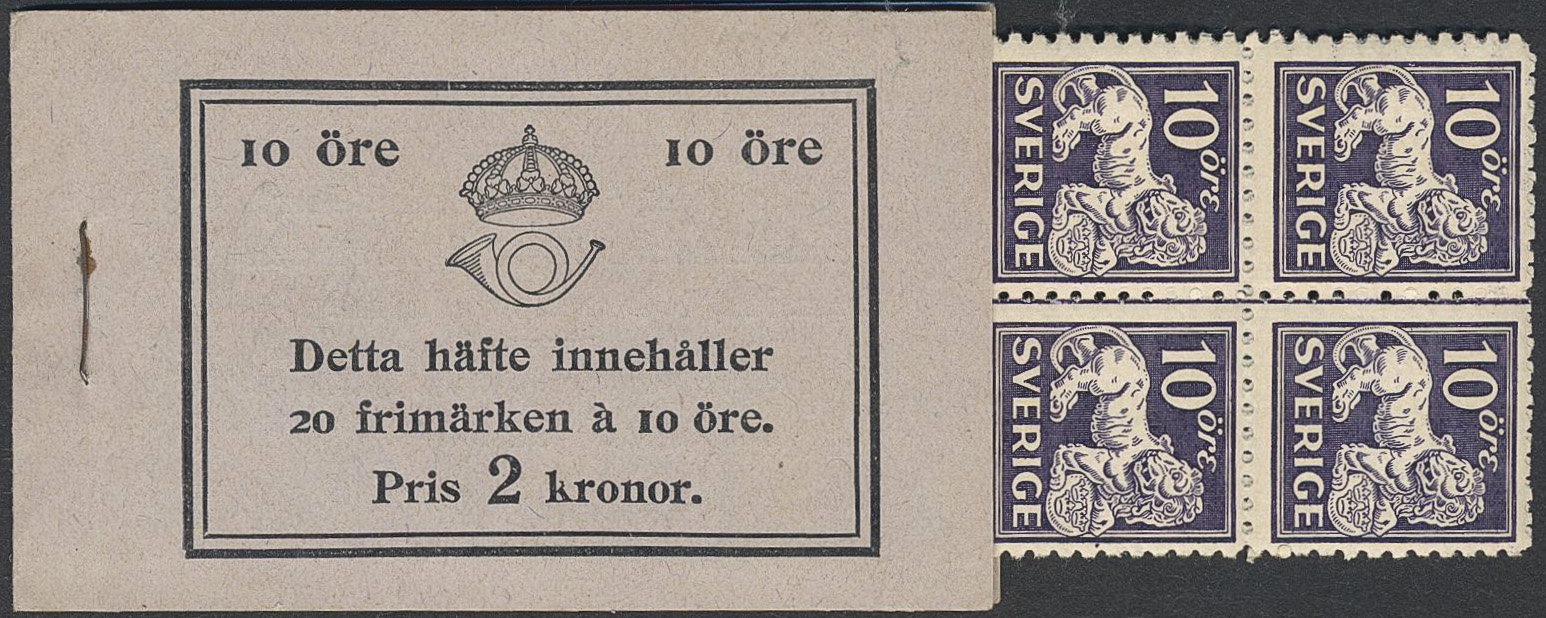 Sweden. Booklet Facit H18 IIAa O, 1933 Standing Lion 20 × 10 öre violet type II, “Postsparbanken & Postgirot” on cover. Normal paper. The stamps in the rare blackish ulmarish violet. Rarity. Ex. Contenta. SEK 28000+