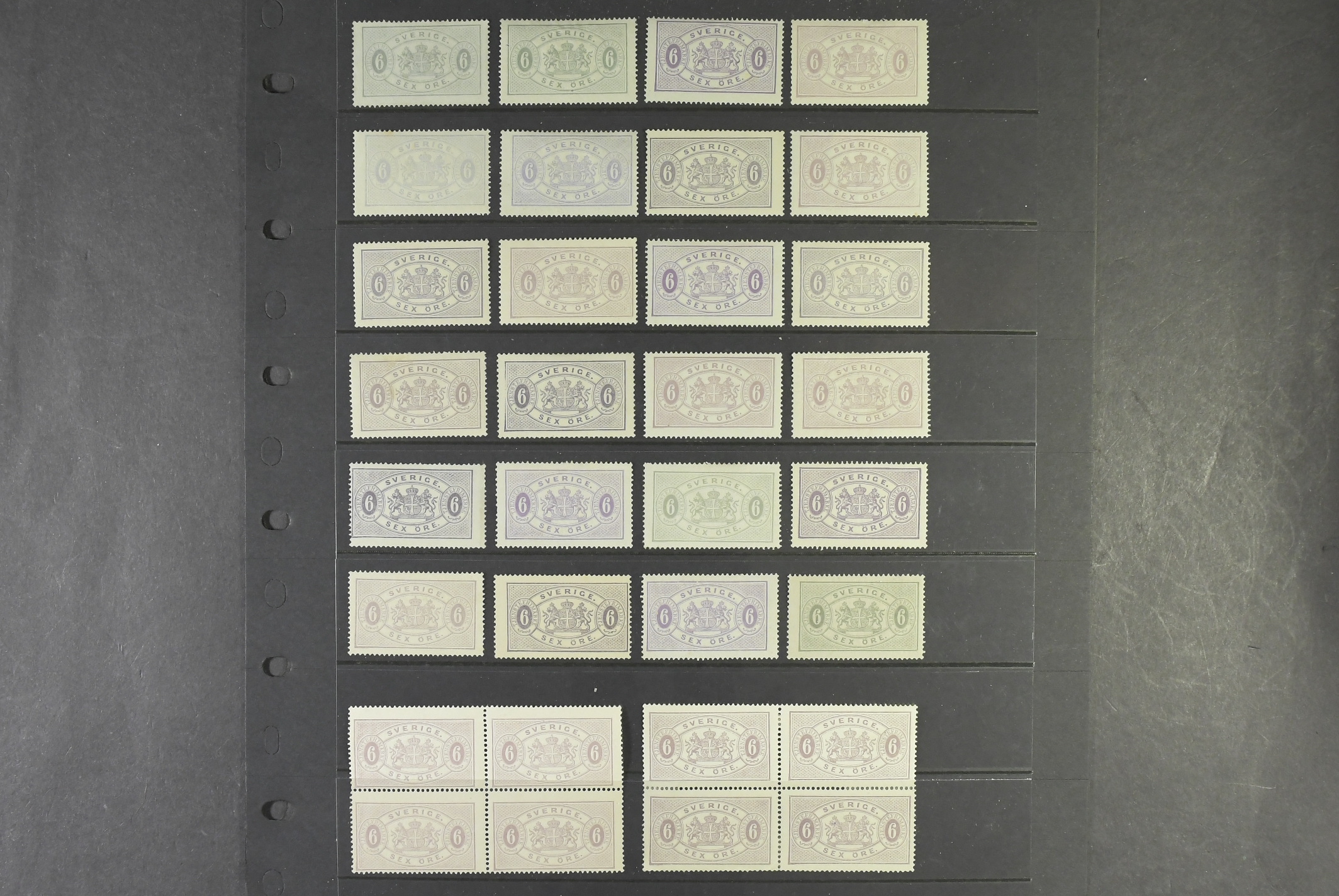 Sweden. Collection ★/(★) OFFIALS perf. 14 on visir leaves. Duplicate lot incl. several different shades, partly in blocks of four. Mixed quality incl. a few MNH and several without gum, but also fine examples. Very high catalogue value. Please inspect. Ex. Contenta. (92)