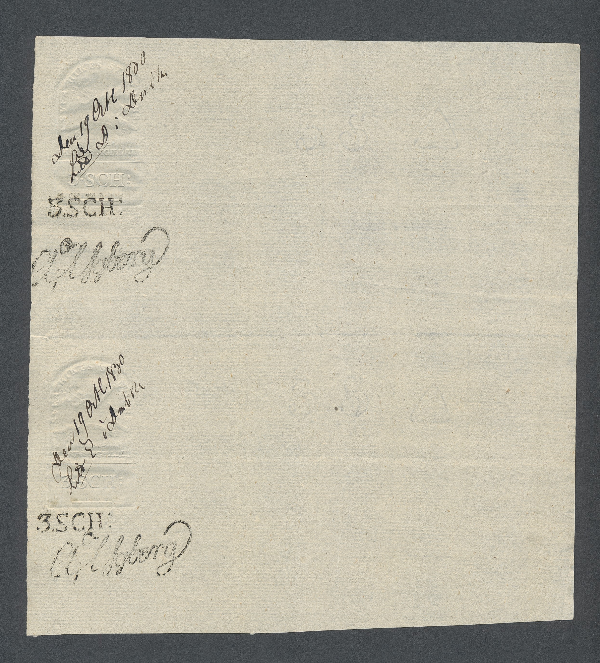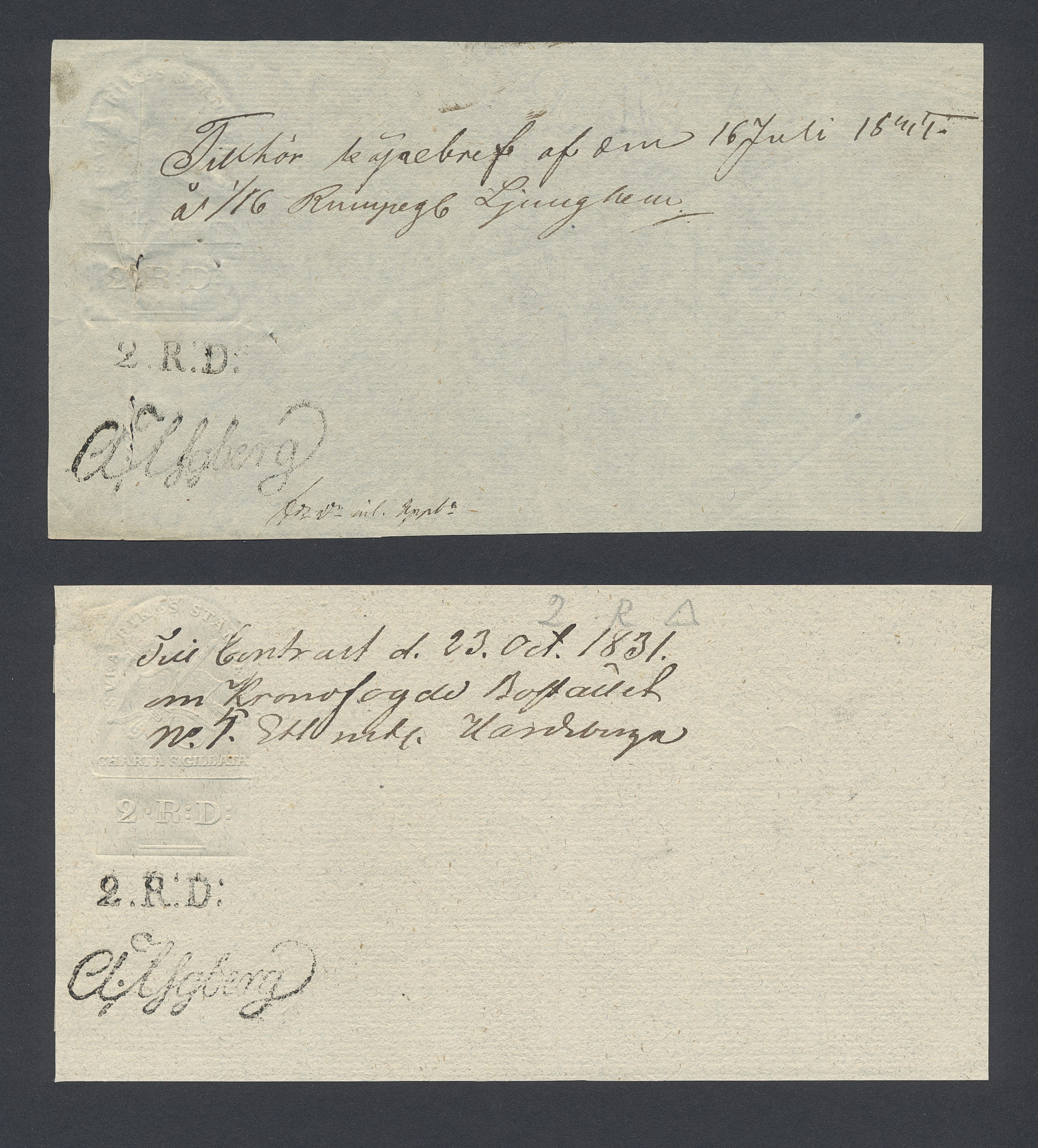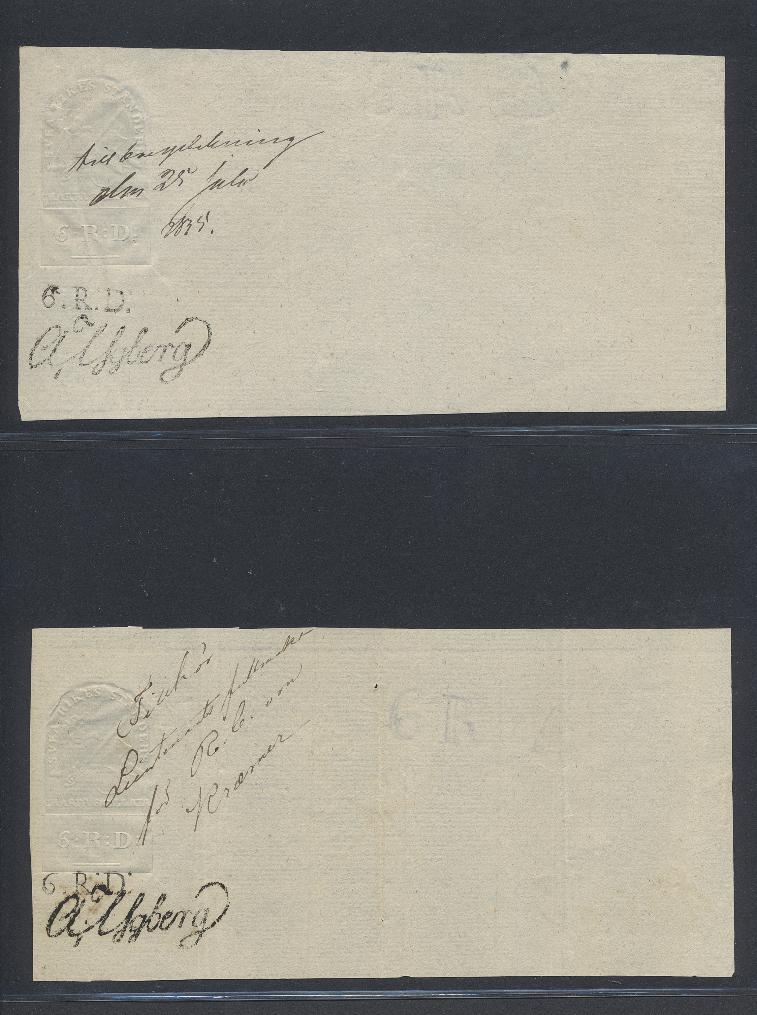 Sweden. Revenues, collection 1811–1844 in two albums. Documentary stamp, 1811 edition. Ygberg nameprint. Extensive collection 3 sch–50 Rd, just missing four denominations (32 sch, 1 1/3, 1 2/3 and 4 Rd). Specialized on watermark and paper with a large number of rare variants, e.g. mirror positions. 174 items in total incl 15 denominations graded as "R" in Facit 2015. A compilation nearly impossible to obtain. The cat. value exceed 40000 SEK with a substancial premium for the variants. A list of the content and pictures of almost the entire lot are presented at www.philea.se. Ex. Per Sundberg. (174)