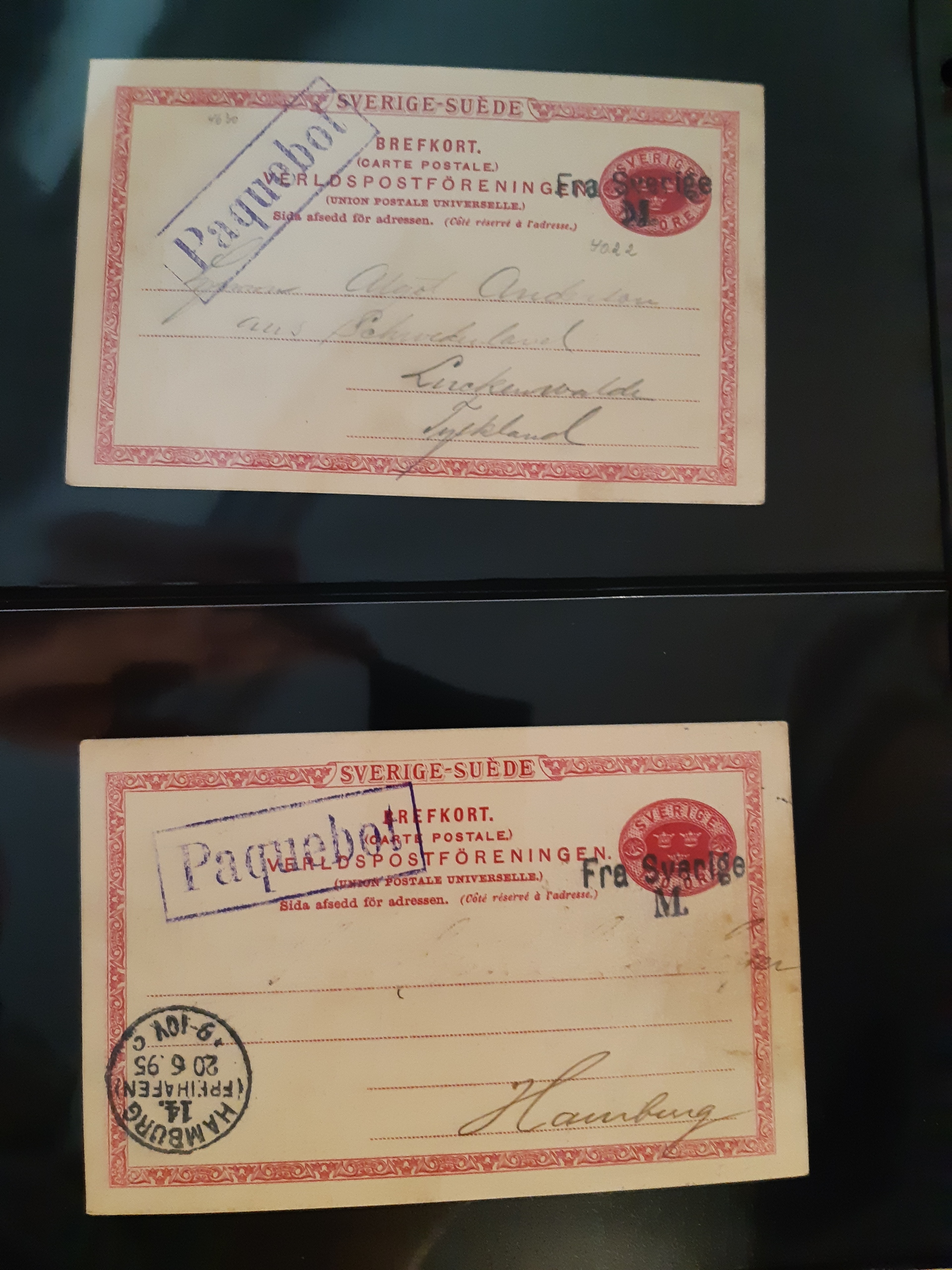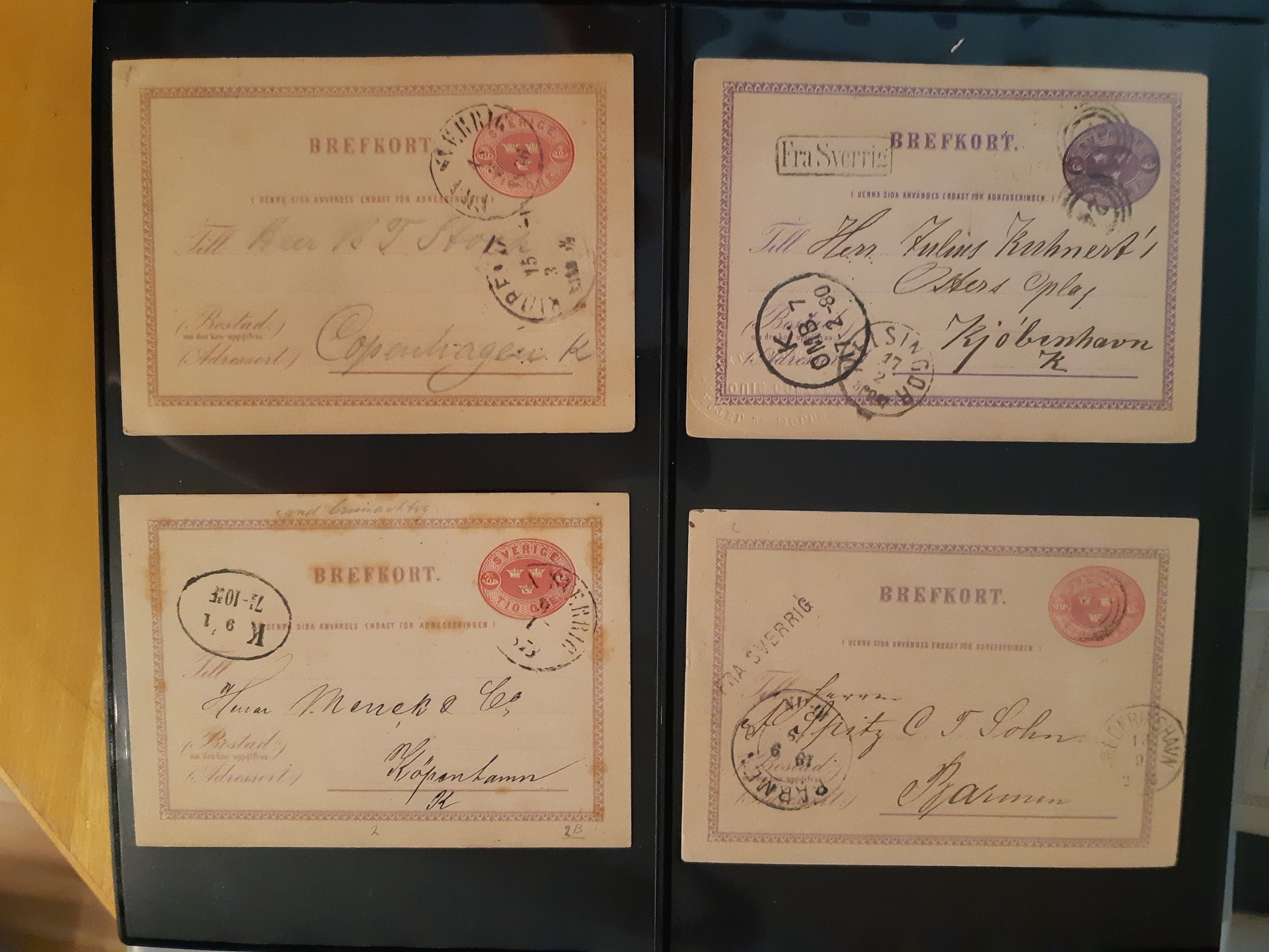 Sweden. Cancellations, collection/accumulation FOREIGN POSTMARKS in album. Danish pmks on postcards sent to mostly Denmark and Germany. Incl. e.g. early FRA SVERRIG, numeral cancellations, PAQUEBOT, etc. Somewhat mixed quality. (75)
