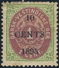 Danish West Indies. Facit 28PT1 ★, Proof 10 CENTS on 1 cent brown-lilac/green with small digits. Some foxing as usual. Scarce! Ex. Contenta. SEK 15000