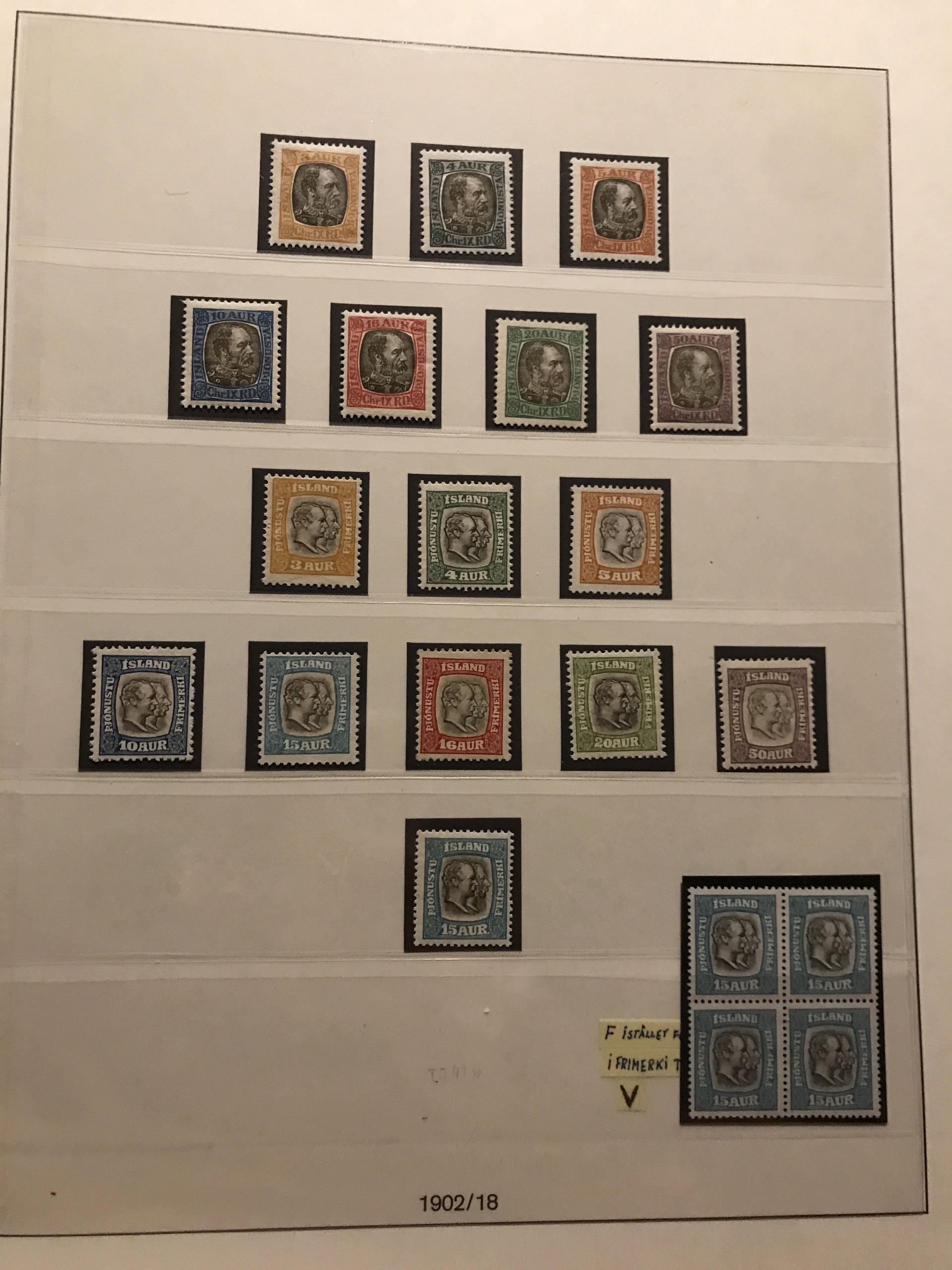 Iceland. ★★/★. Collection 1873-1971 in Lindner falzlos album with slip case. Containing six Skilling values incl. F1 and 5(*), cpl Aur-values except F30, good I GILDI, cpl F63-164 incl. F63-75, 79-90, 118-20, 122, 135, 152-57 and 160-64** etc. Very nice Official stamps and several varieties etc. Cpl from Facit nr 165 and apparently ** from 1932. Some certificates is enclosed incl. F14a * and F51** etc. Please see a selection of scans at www.philea.se.