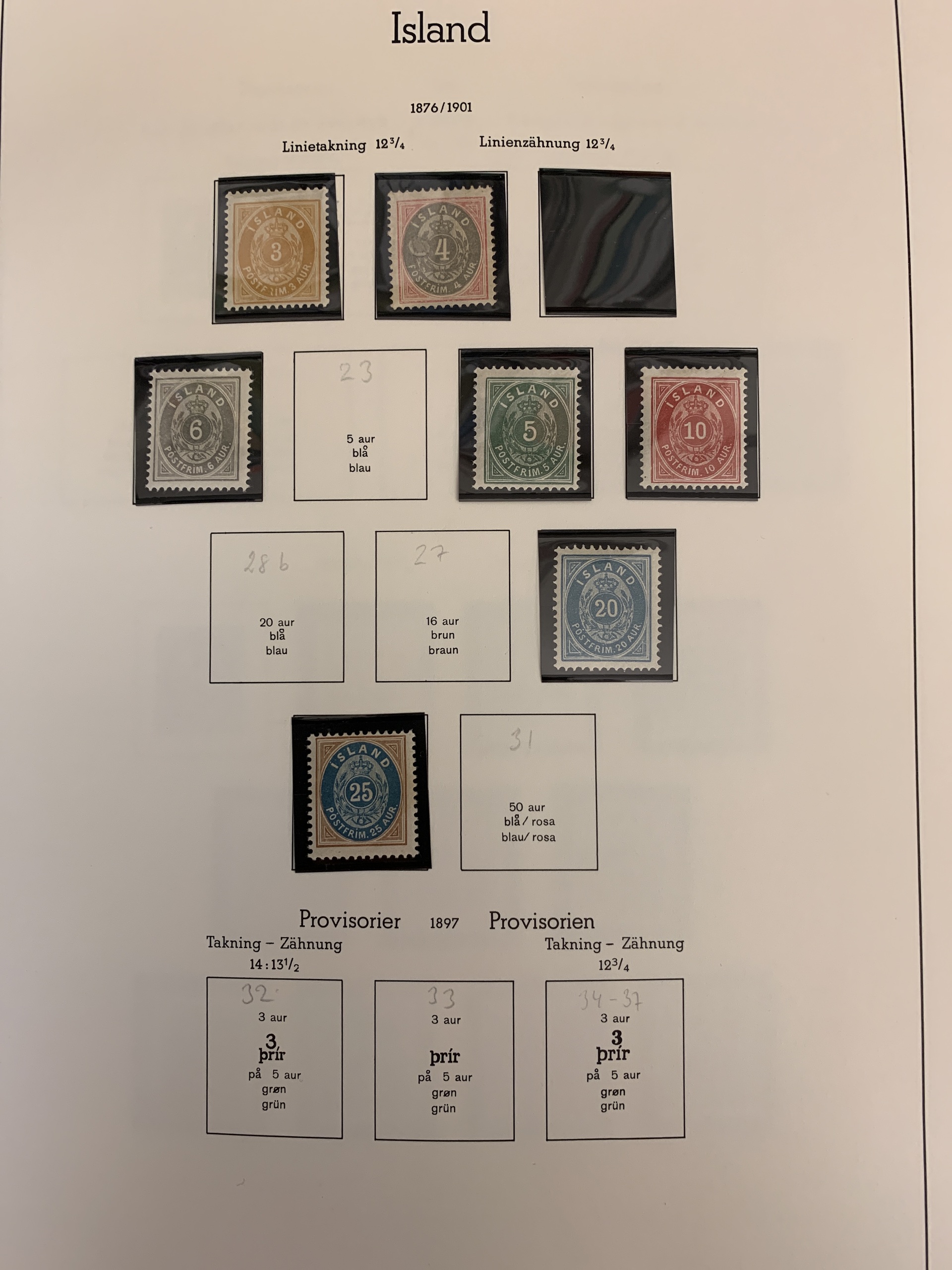 Iceland. Collection ★★/★ 1873–2005 in green Schaubek album with home made mounts. Nice and well filled. Please see a selection of scans at www.philea.se. Also Denmark and Finland used in two stock albums.