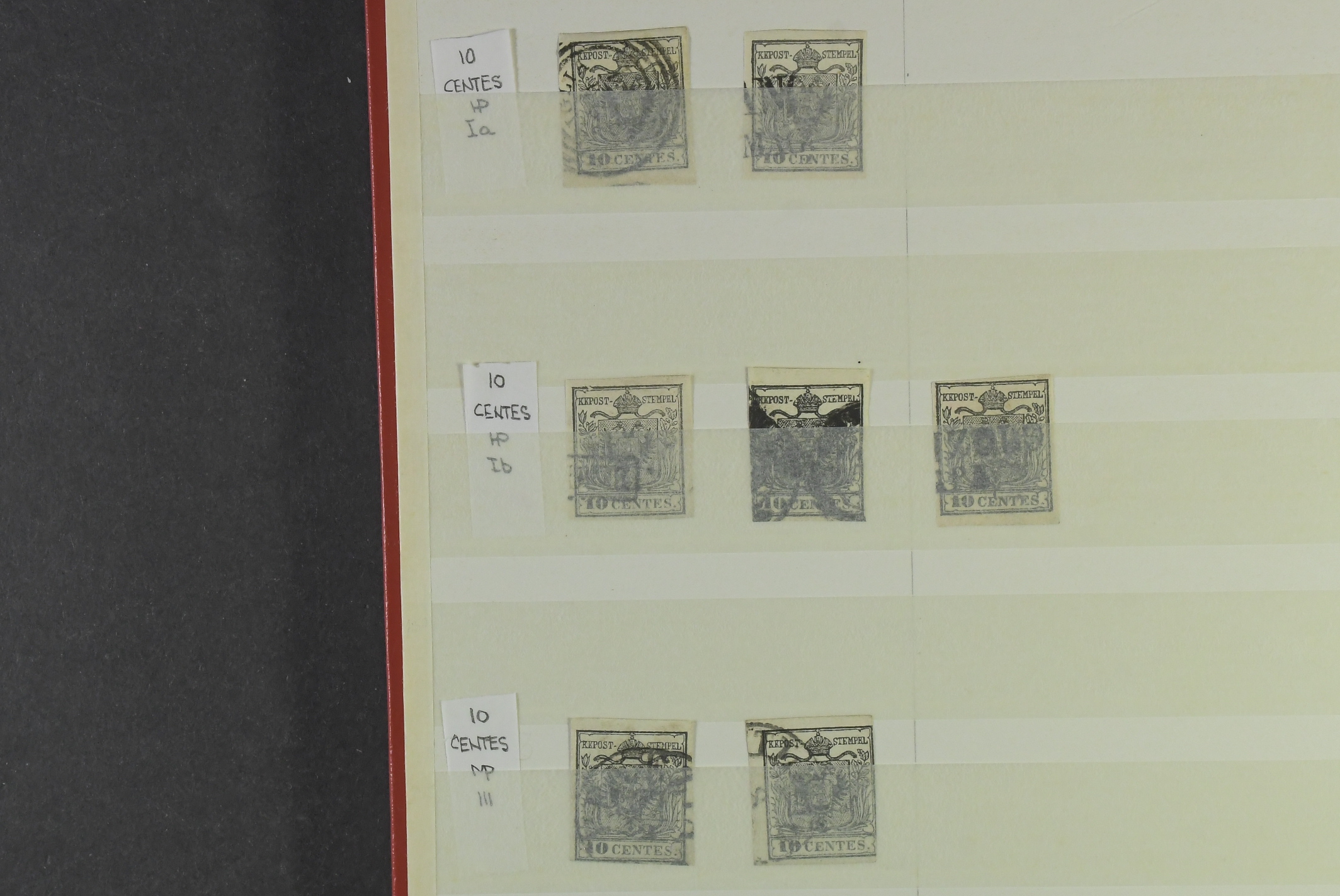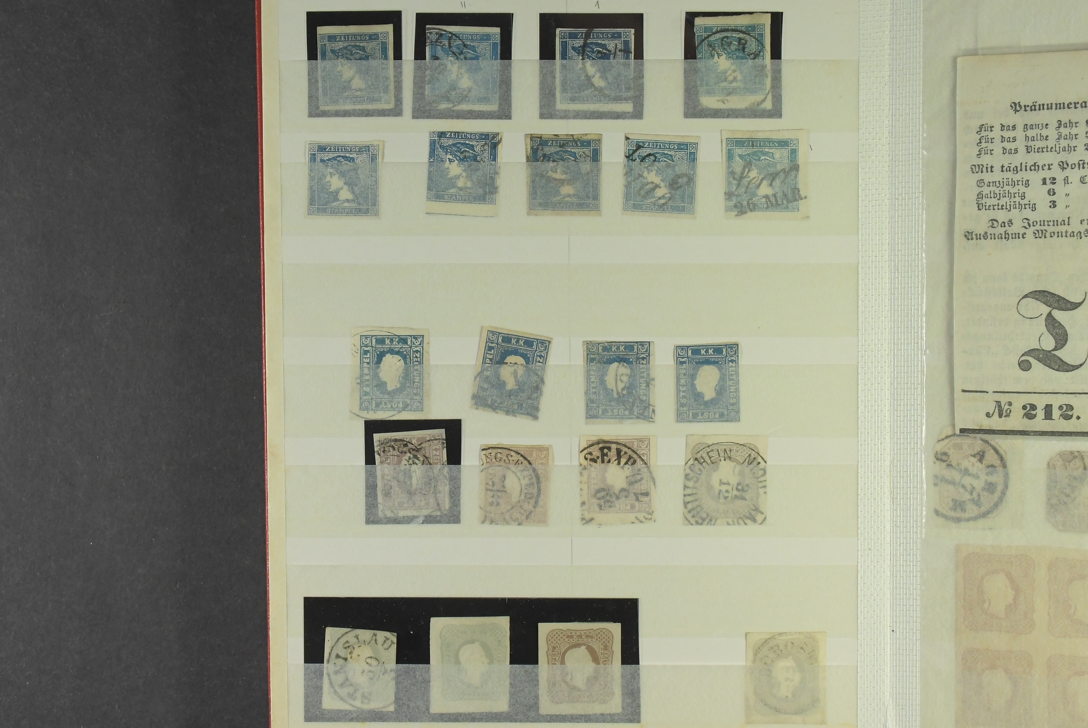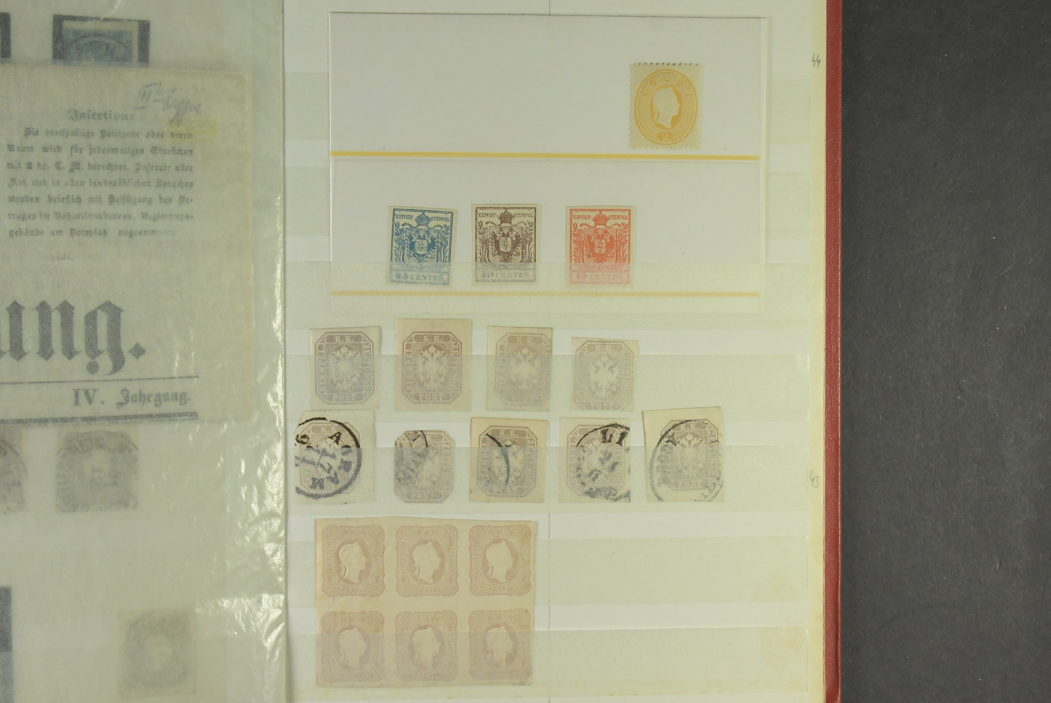 Austria. Accumulation ★/⊙ 1850–1863 in small stockbook. Interesting with first Issues (Mi 1–5) all well described with papers and types. A wide range of cancels especially on the 3–9 kr issues. Second part of album with Lombardy & Venetia first issues also described with papers and types. At the end there is two pages of the earlier newspaper issues. Somewhat mixed quality. (550)