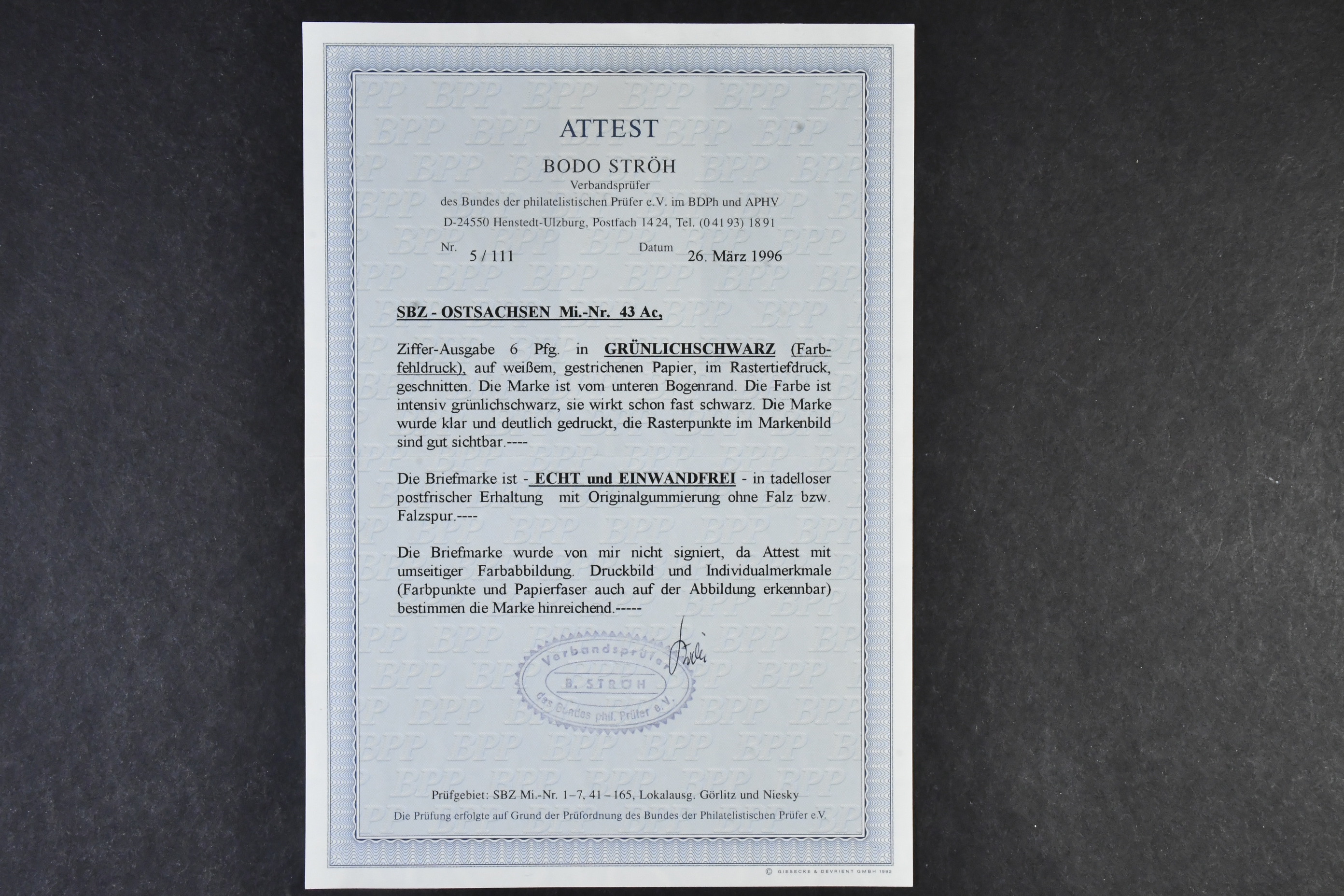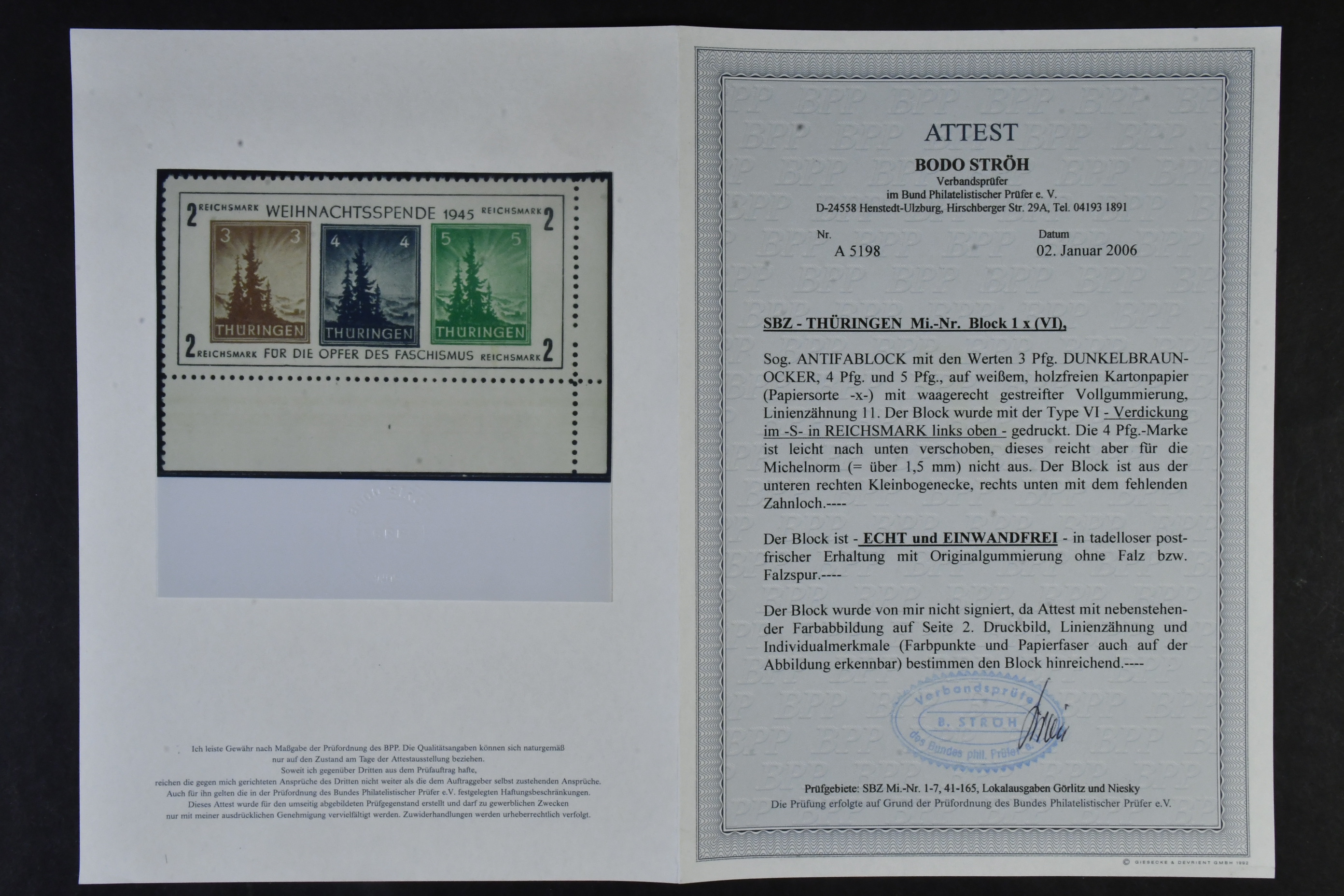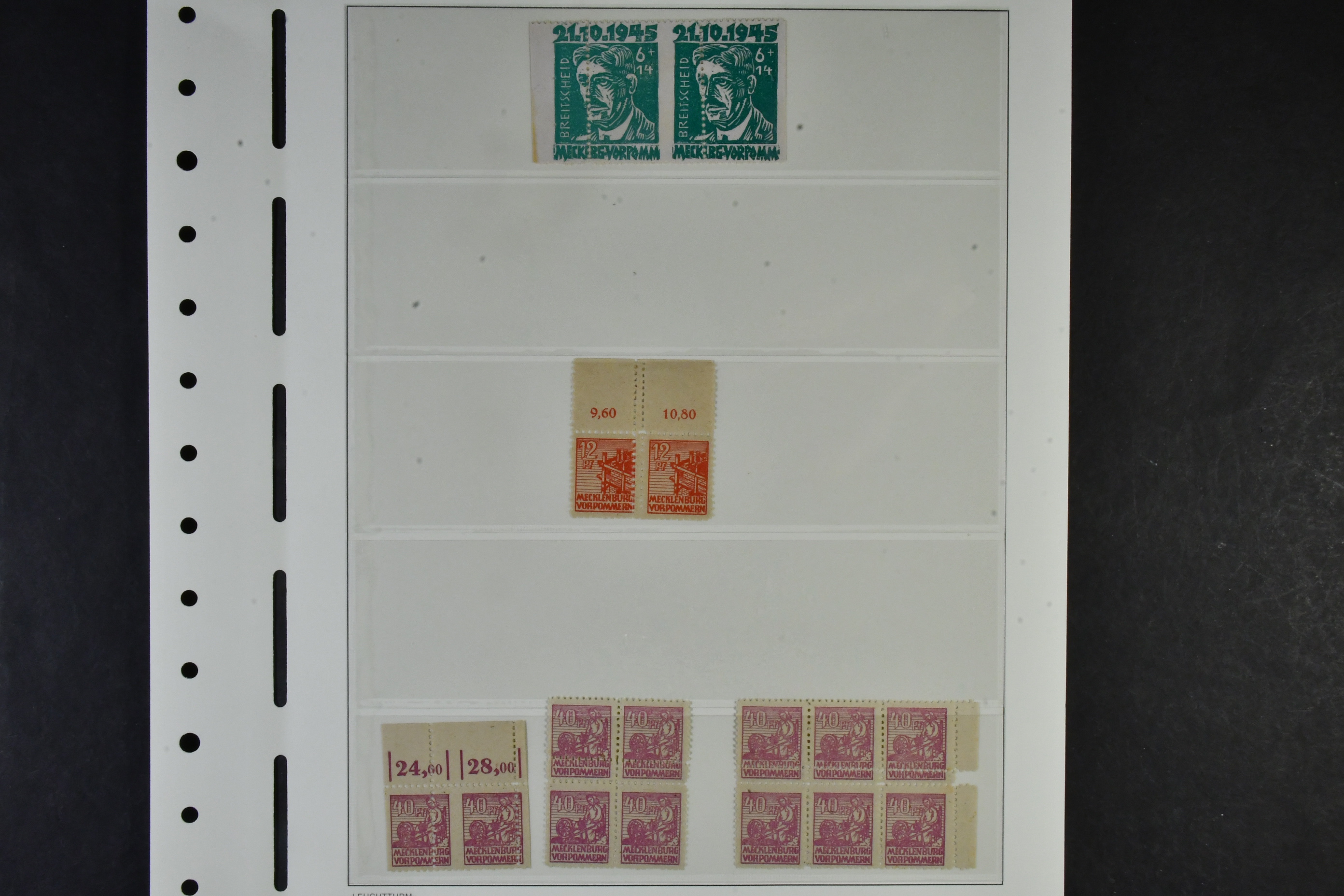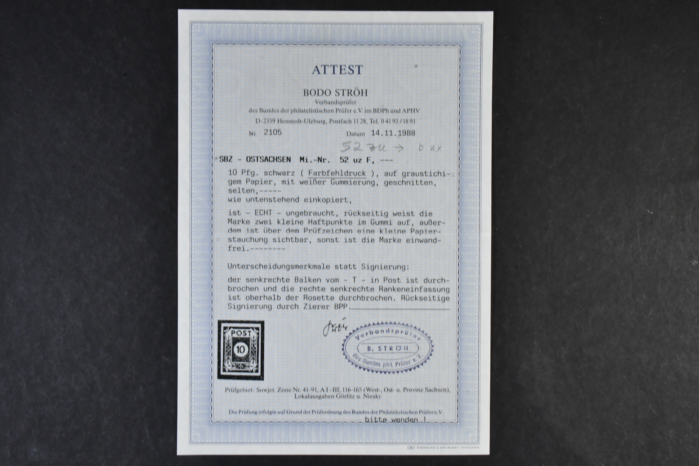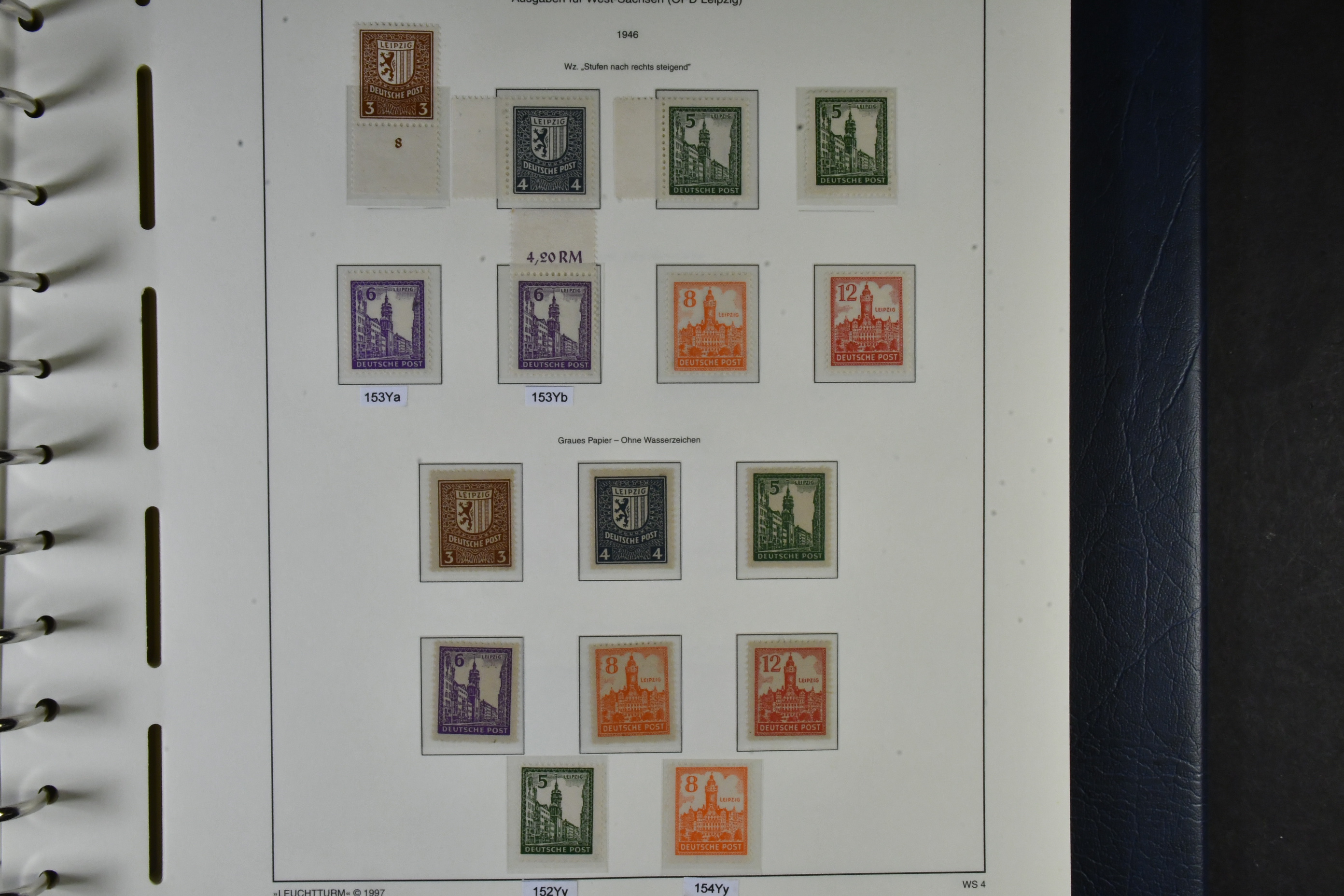 Germany, Soviet zone. Collection ★★ 1945–1949 in two albums with stamp mounts. With few exceptions ** and with all important issues and a wast amount of signed/certified colours and watermark varieties, printing signs, plate errors and varieties, all areas from Berlin-Brandenburg to the General Issues. The catalgoue value is close to EUR 90000 and cosidering the amount of really good material included, the reserve is moderate! The entire lot includes a description in German of some important items avaliable on our website. Fine quality. Approx. 6 kg.