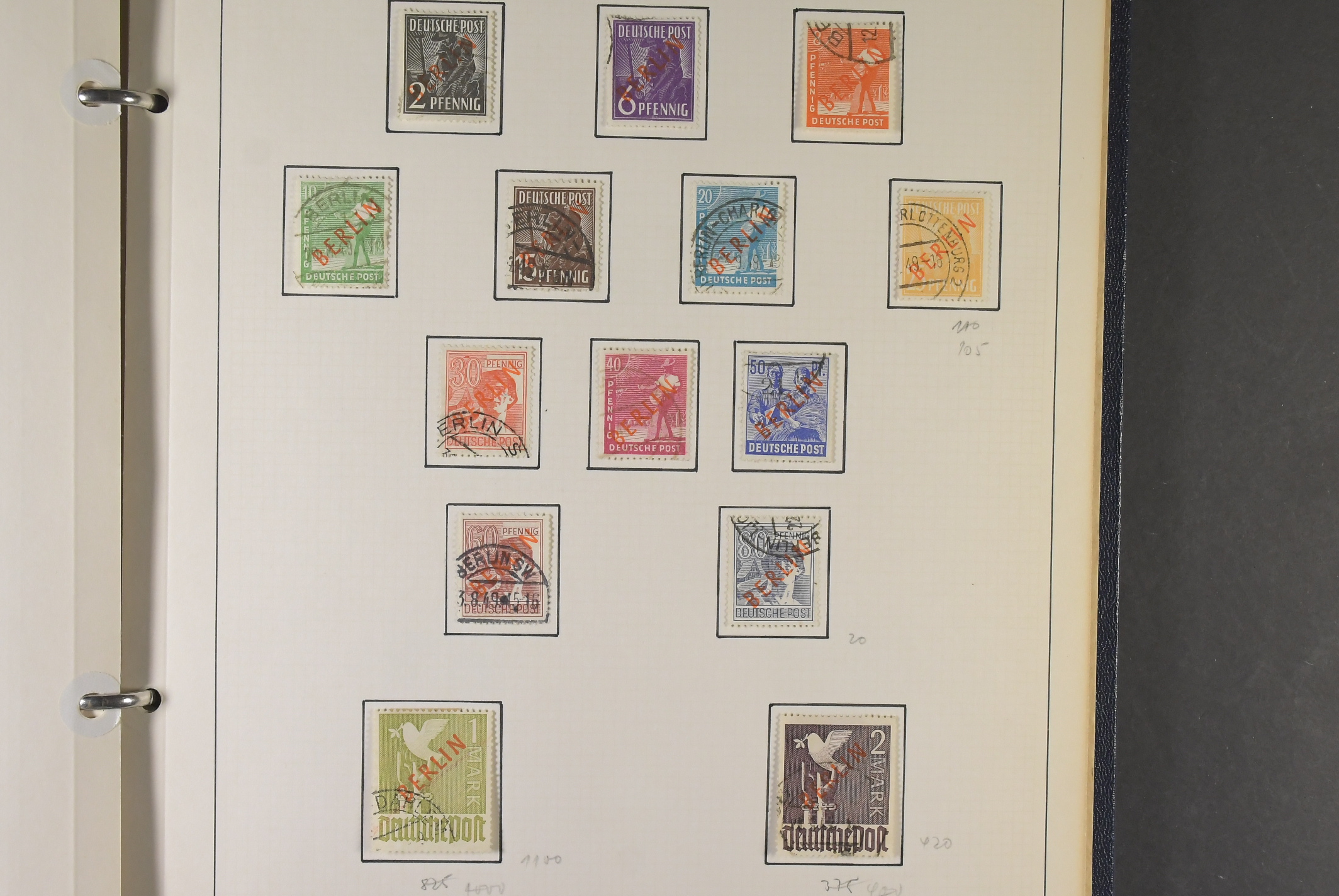 Germany, Berlin. Collection used 1949–1991 in album. Complete with Berlin overprints in both colours and S/S with postal cancel. Black overprint 5 m signed Richter. From 1963 in stockbook with a few spaces at the end. A collection we recommend. Please see a selection of scans at www.philea.se. Fine quality. (800)
