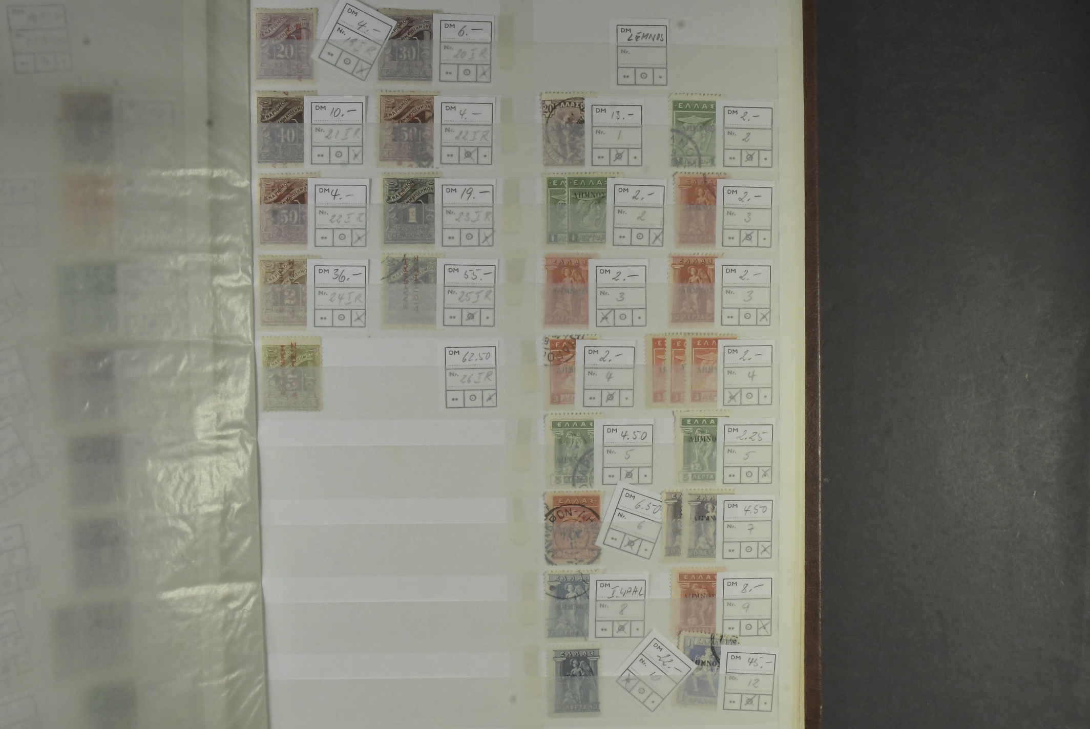 Greece. Accumulation ★★/★/⊙ 1896–1965 in large stockbook. Comprehive with many better and medium priced stamps, the unused until 1934 often without gum but high cat.value and also many good used copies (e.g. the Olympic issues), better ovpt stamps, etc. E.g used Mi 122x2, 143x2, 157 (also an x copy), 344x2, Zeppelin 1933, 355–361, 362–68, 369–71x2m 536–75 **, etc. Also back of the book and Greek occupation in Turkey. Somewhat mixed quality.