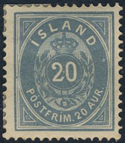 Iceland. Facit 15 ★, 1882 Aur values 20 aur blue, perf 14 × 13½. SEK 3000