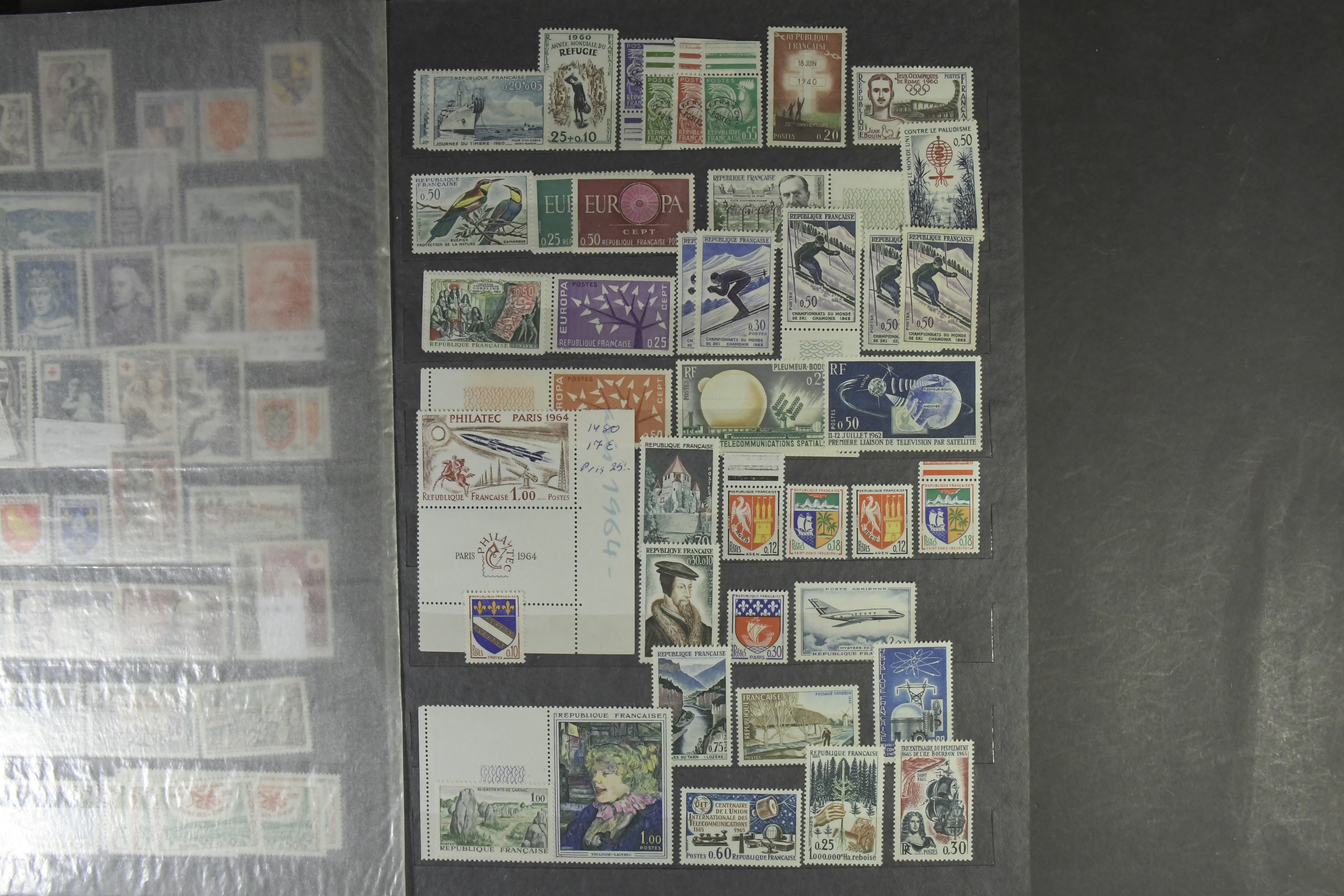 France. Accumulation ★★ 1949–1979 on visir leaves and in three club books. Stock with lots of stamps incl. some Monaco, Luxemburg and Spain. Fine quality. (1000)