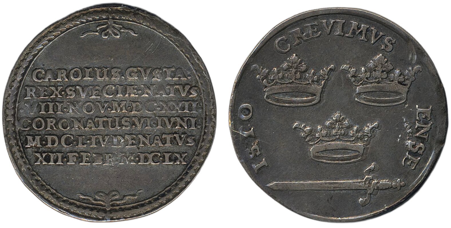 Coins, Sweden. Karl X Gustav, SM 43, 1/3 riksdaler (largesse money) 1660. 8.61 g. Stockholm. Text on six lines. Minor scratches, some lustre. 1+/01.