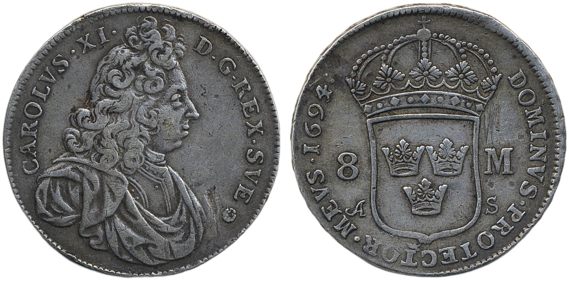 Coins, Sweden. Karl XI, SM 66, 8 mark 1694/3. 31.27 g. Stockholm. 1/1+.