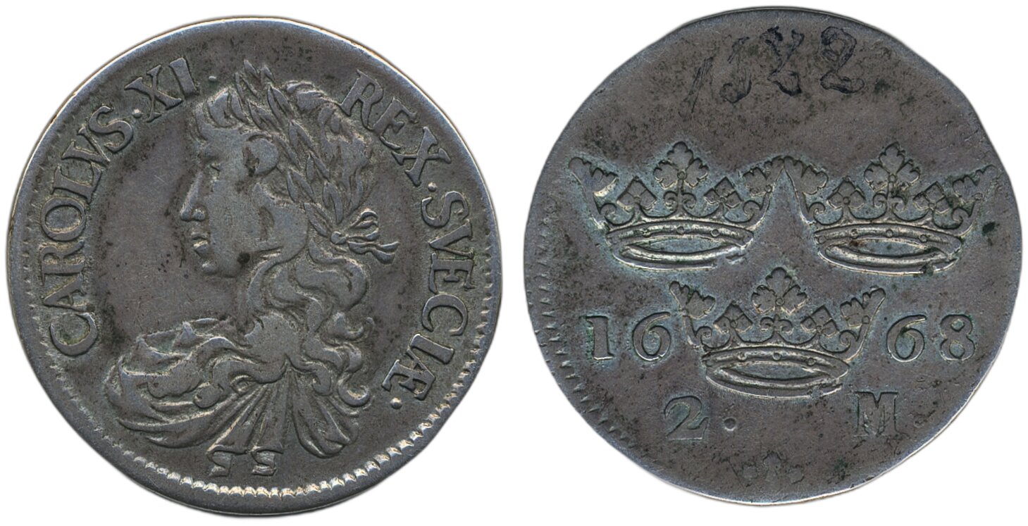 Coins, Sweden. Karl XI, SM 121b, 2 mark 1668. 9.78 g. Stockholm. Small traces of old inventory number in ink on reverse. Ex. MISAB 9 lot 367. SMB 166. Göhle. 492. 1/1+.