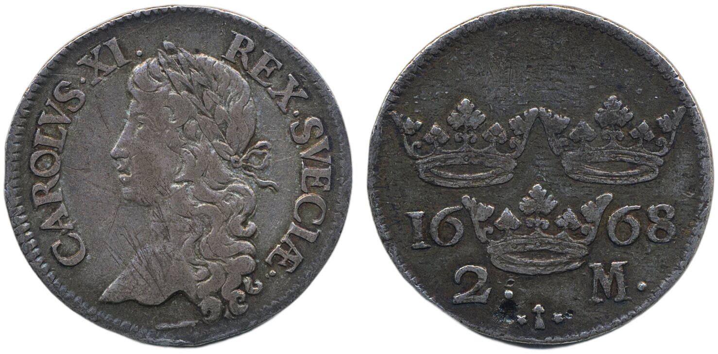 Coins, Sweden. Karl XI, SM 122, 2 mark 1668. 9.57 g. Stockholm. Minor obverse scratches. SMB 168. Göhle 517. 1+.