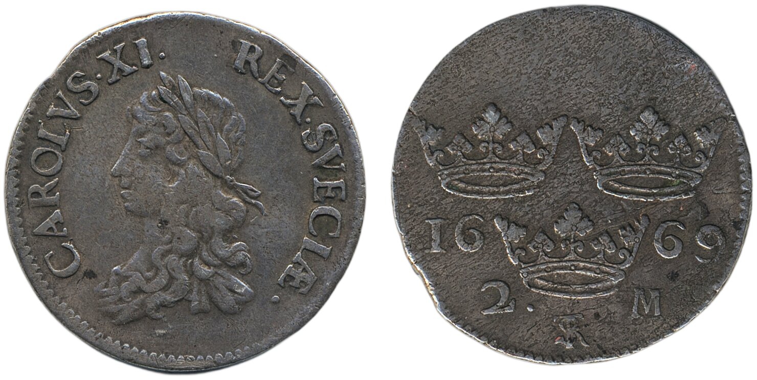 Coins, Sweden. Karl XI, SM 124a, 2 mark 1669. 9.34 g. Stockholm. Minor edge irregularity, as made. Göhle 547. 1+.