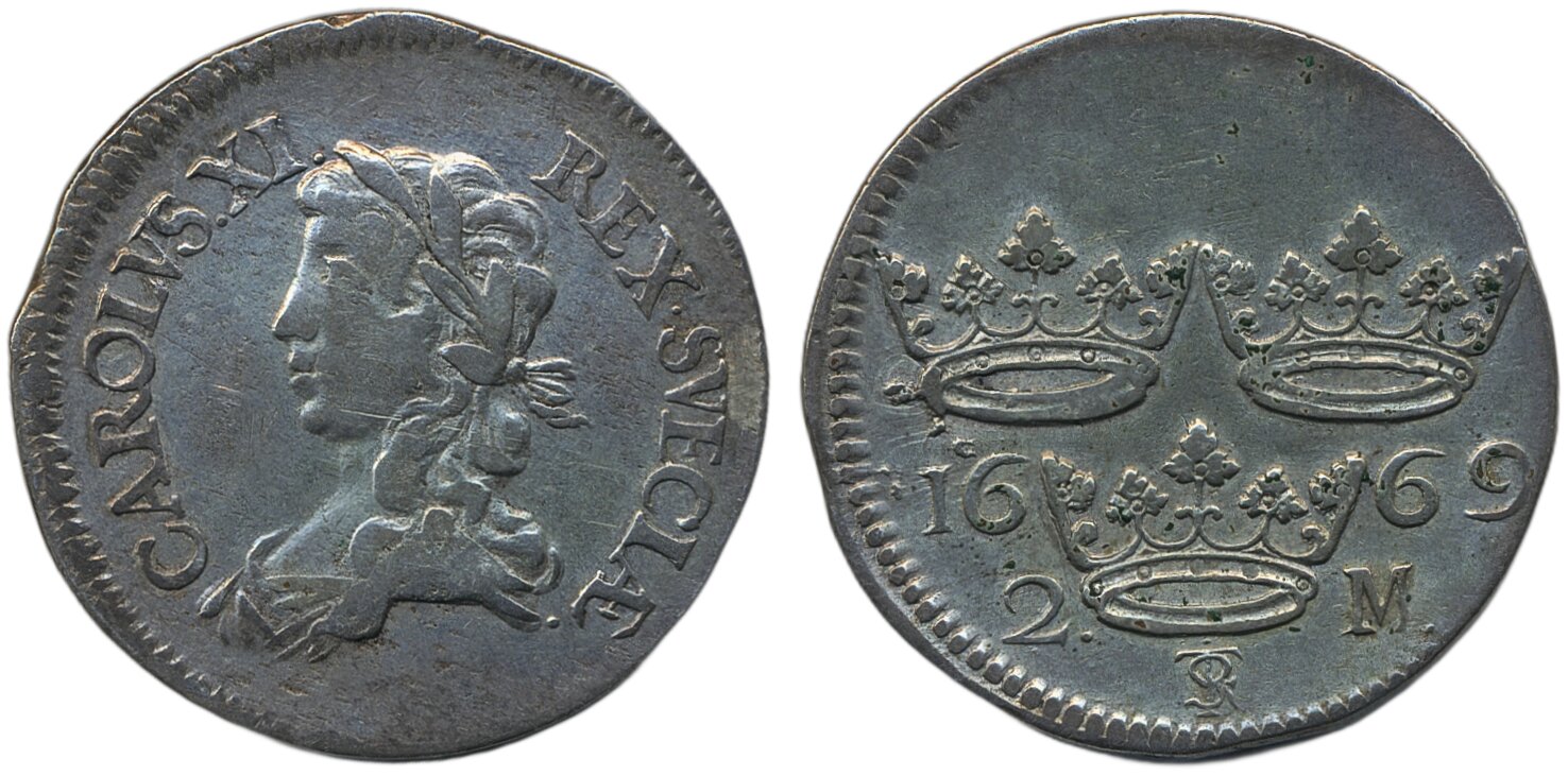 Coins, Sweden. Karl XI, SM 124a, 2 mark 1669. 10.55 g. Stockholm. Lightly cleaned obverse. SMB 176. Göhle 581. 1/1+.