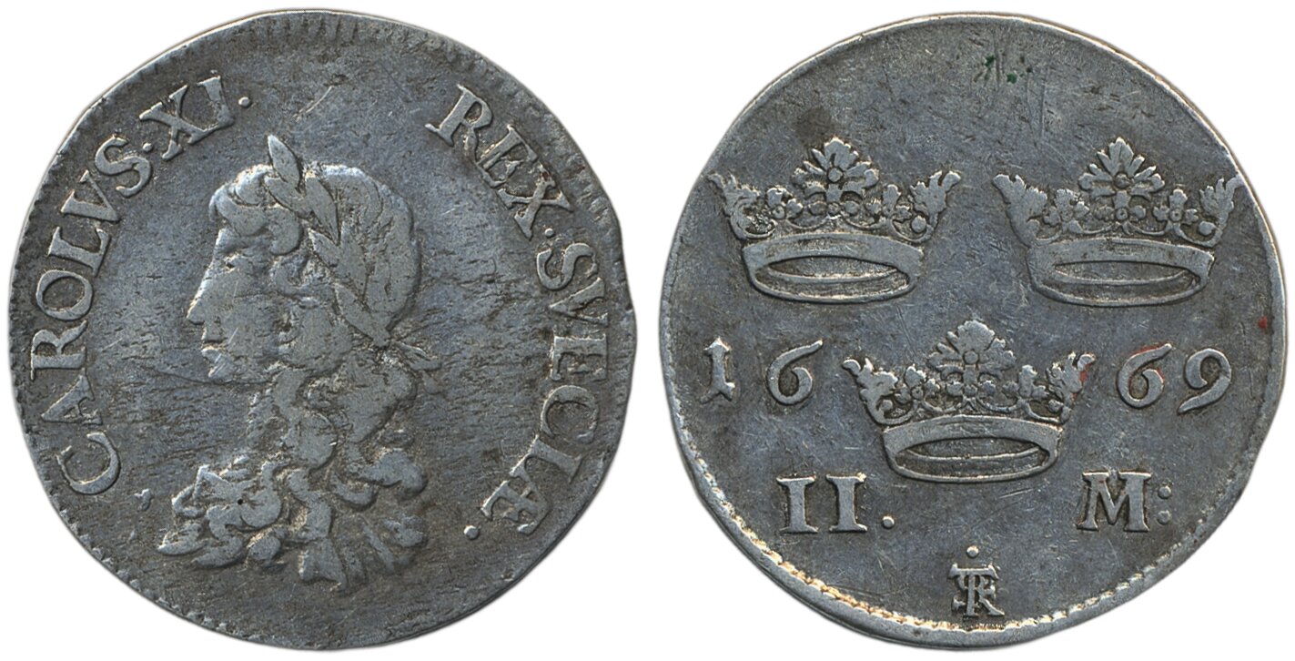 Coins, Sweden. Karl XI, SM 124a, 2 mark 1669. 10.30 g. Stockholm. SMB 182. Göhle 534. 1/1+.