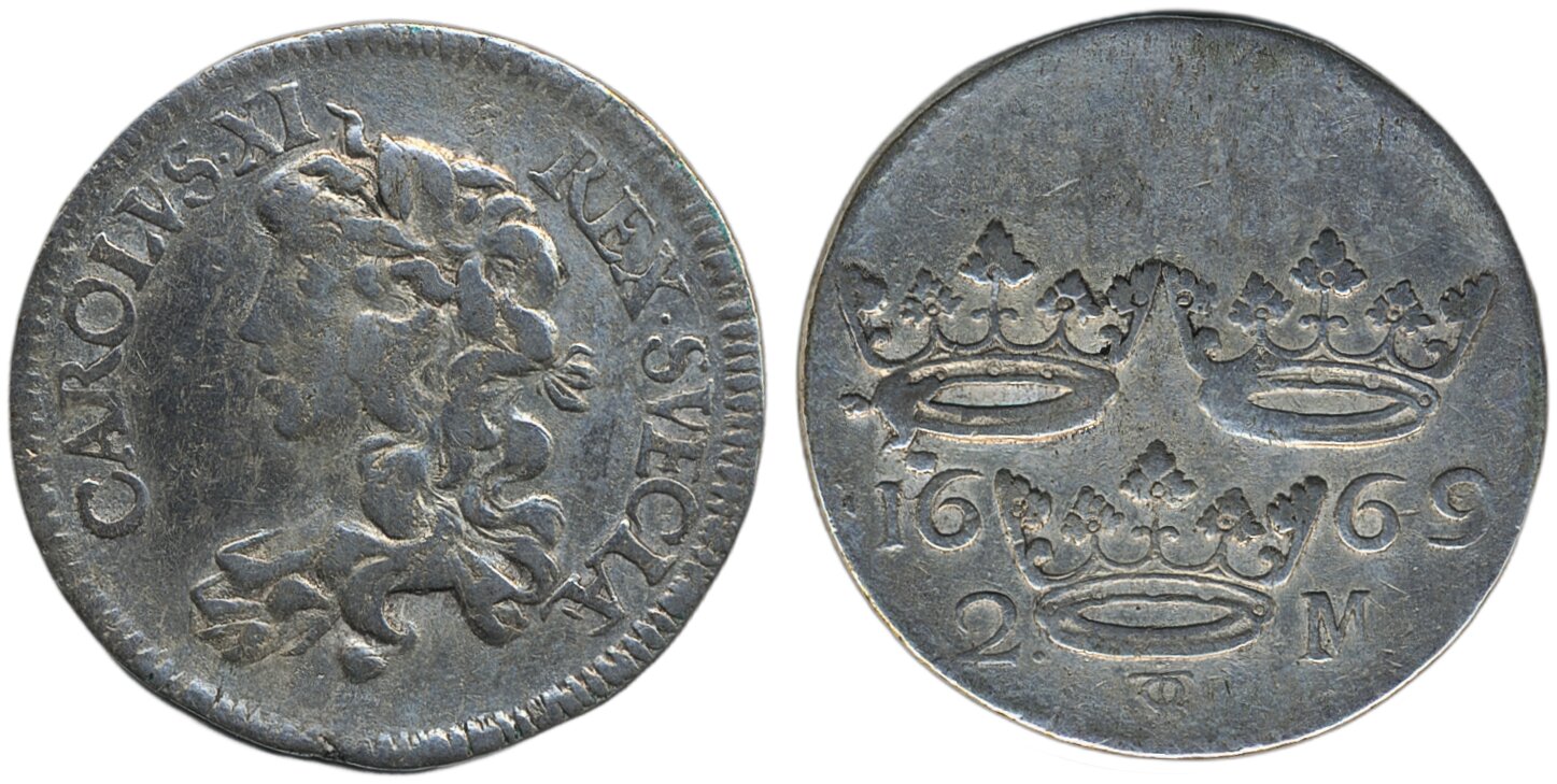 Coins, Sweden. Karl XI, SM 124a, 2 mark 1669. 10.24 g. Stockholm. Cleaned. SMB 176. Göhle 578. 1/1+.
