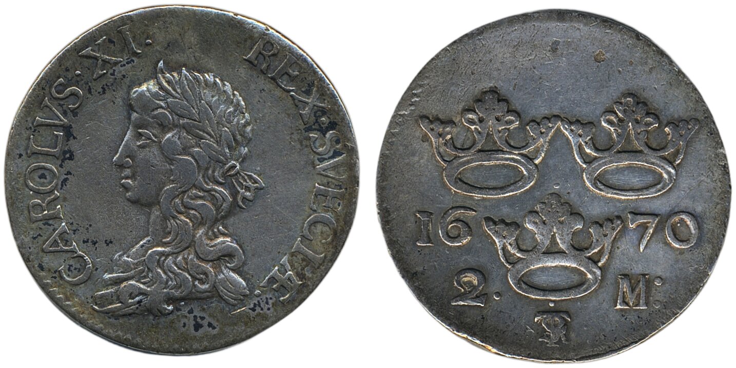 Coins, Sweden. Karl XI, SM 125b, 2 mark 1670. 9.76 g. Stockholm. Minor hairlines. Ex. Ahlström 57 lot 435. SMB 186. Göhle 634. 1+.