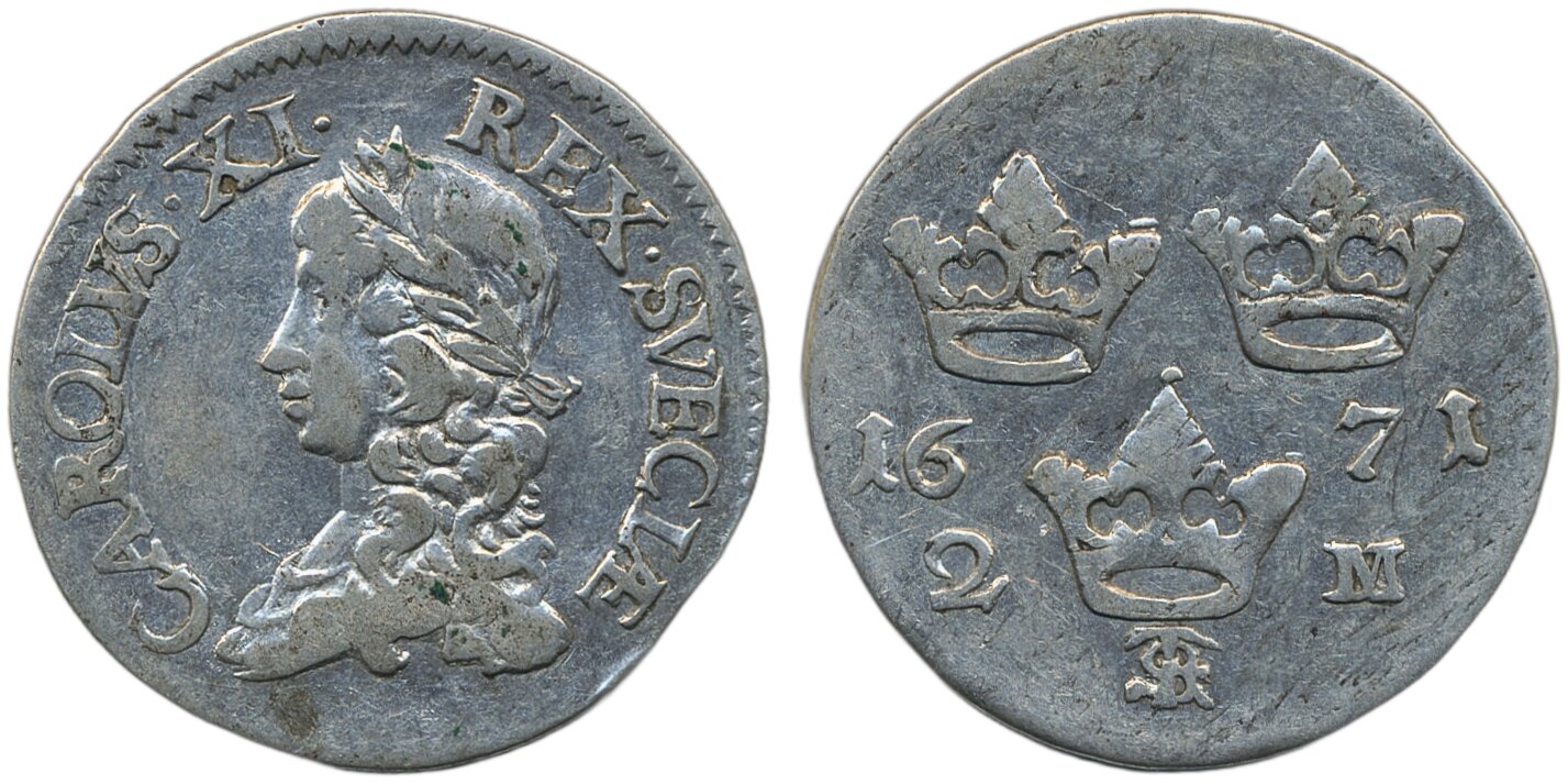 Coins, Sweden. Karl XI, SM 126a, 2 mark 1671. 10.42 g. Stockholm. Cleaned. SMB 192. Göhle 734. 1+.