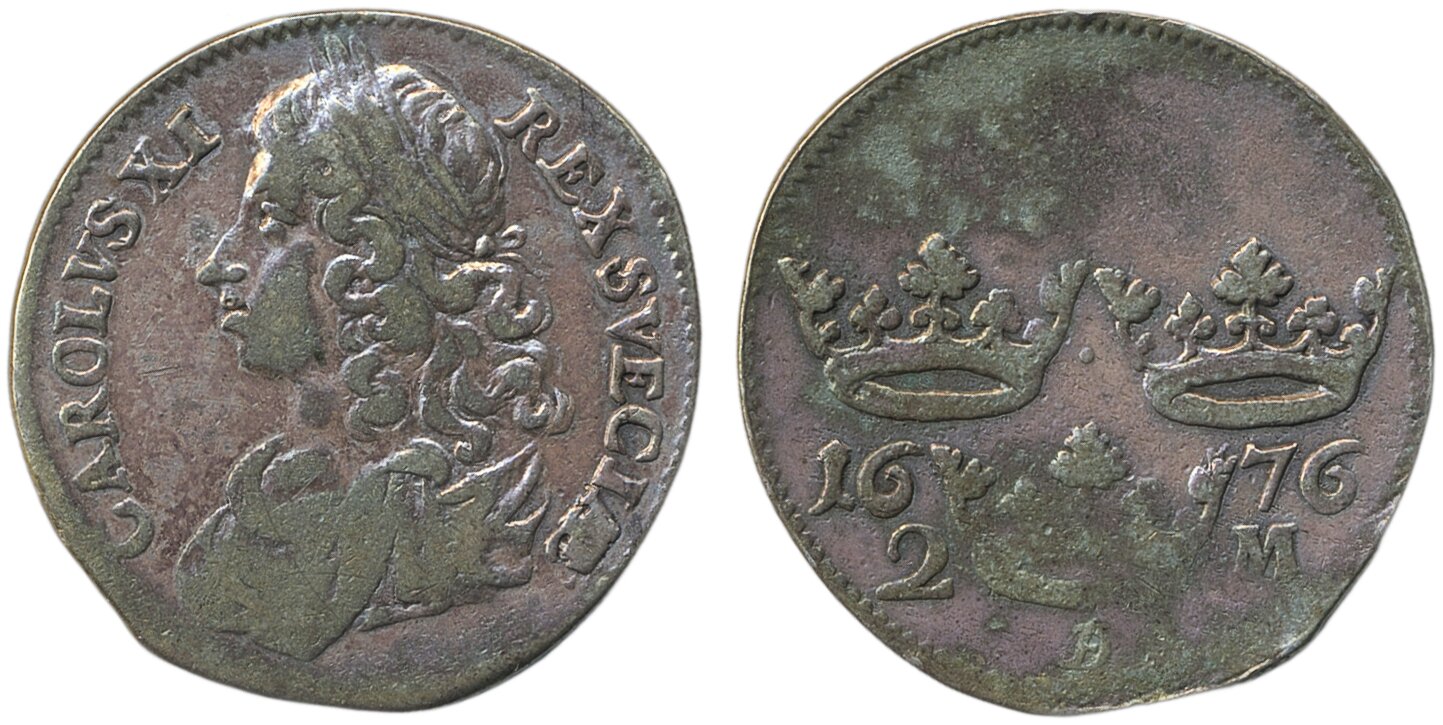 Coins, Sweden. Karl XI, SM 134a var, 2 mark 1676. 10.14 g. Stockholm. Lightly cleaned. RR. SMB 211. Göhle 834. 1/1+.