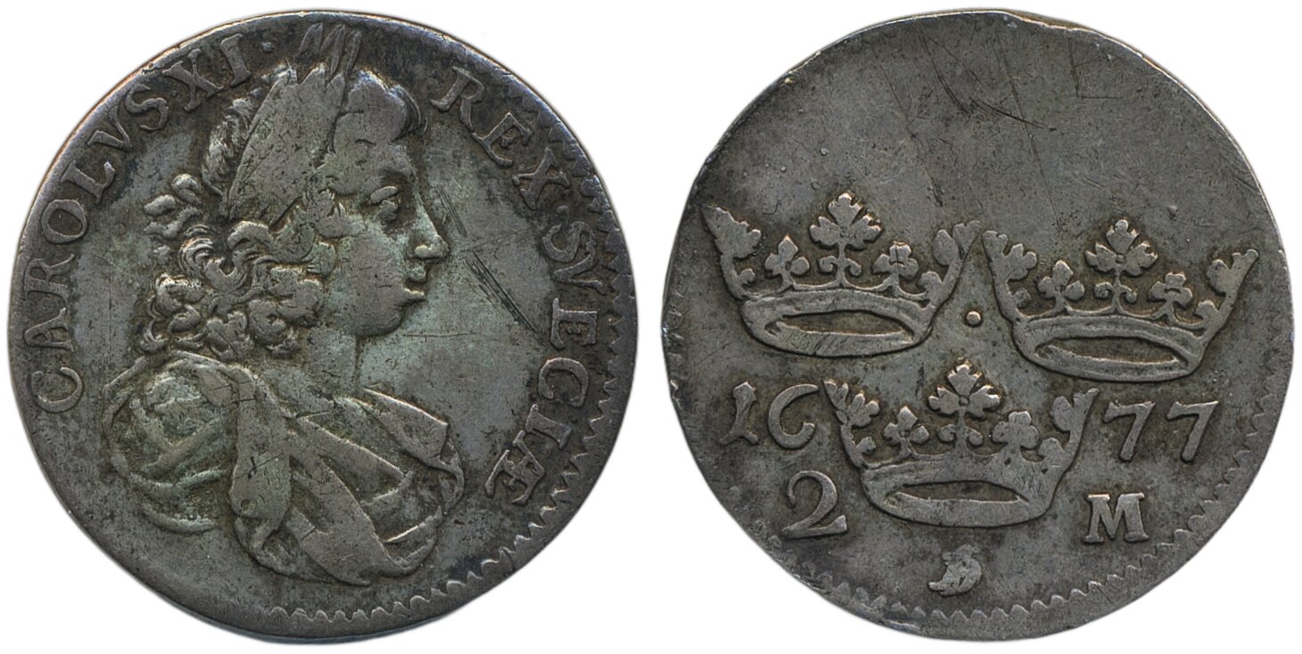 Coins, Sweden. Karl XI, SM 136b, 2 mark 1677. 10.18 g. Stockholm. Legend REX SVECIAE. Small scratches. Ex. Ahlström 25 lot 272. RR. SMB 216. 1/1+.