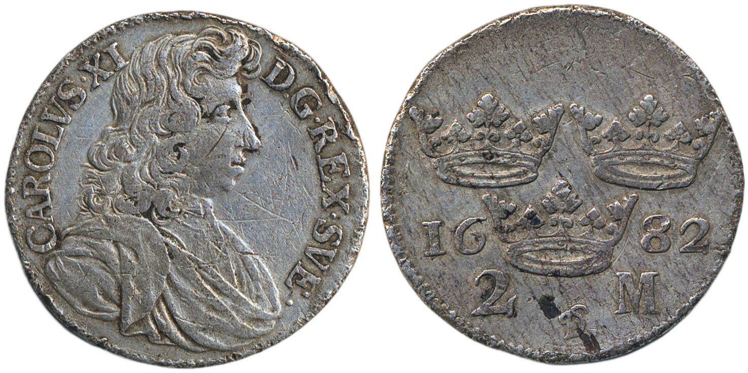 Coins, Sweden. Karl XI, SM 143, 2 mark 1682. 9.57 g. Stockholm. Scartches, rim damage. Reverse planchet flaw. Göhle 881. 1/1+.