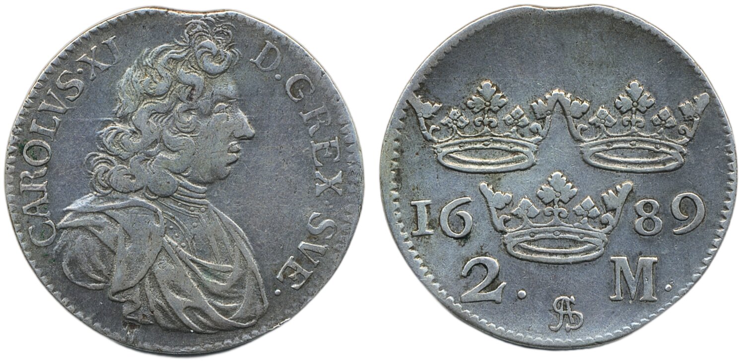 Coins, Sweden. Karl XI, SM 150, 2 mark 1689. 10.30 g. Stockholm. Minor edge clip from production. SMB 232. Göhle 932. 1+.