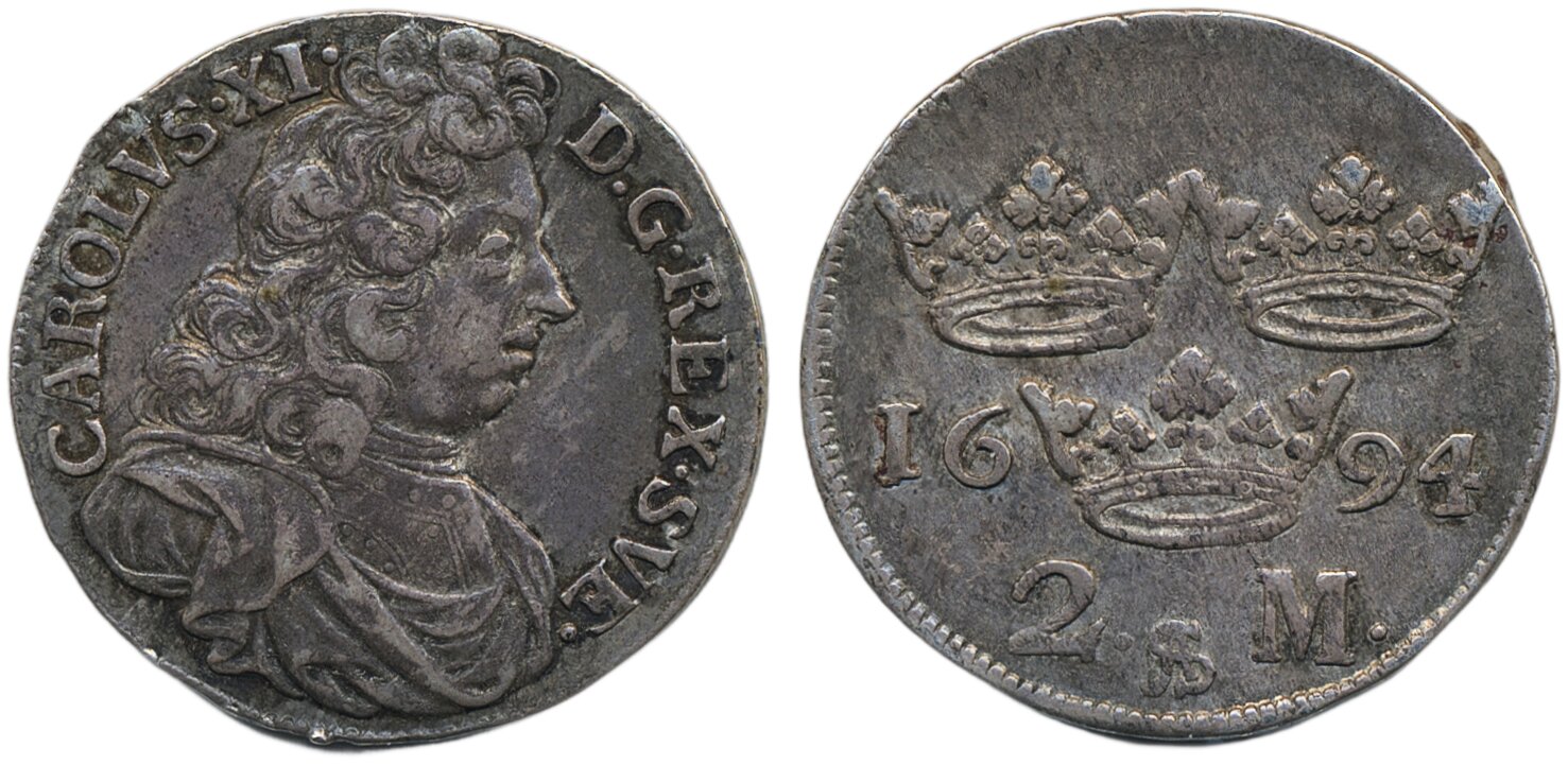 Coins, Sweden. Karl XI, SM 155, 2 mark 1694. 10.08 g. Stockholm. Well struck example with some lustre. 1+/01.