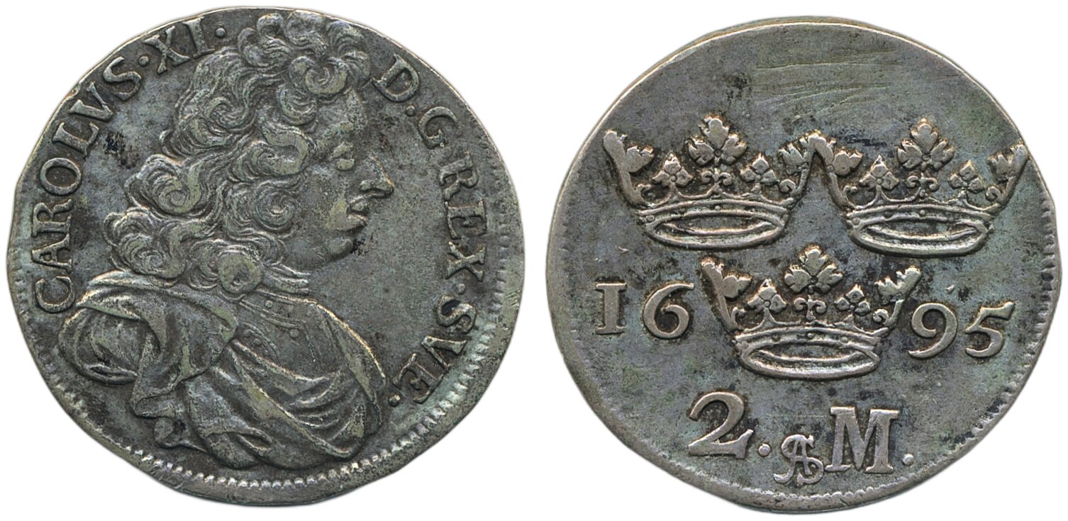 Coins, Sweden. Karl XI, SM 156, 2 mark 1695. 10.02 g. Stockholm. Reverse with scratches. SMB 238. Göhle 1057. 1+.
