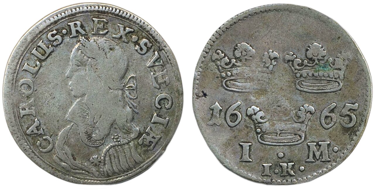 Coins, Sweden. Karl XI, SM 164a, 1 mark 1665. 4.41 g. Stockholm. Minor verdigris on reverse. RR. Ex. Myntkompaniet 31 lot 222. Göhle 17. 1.
