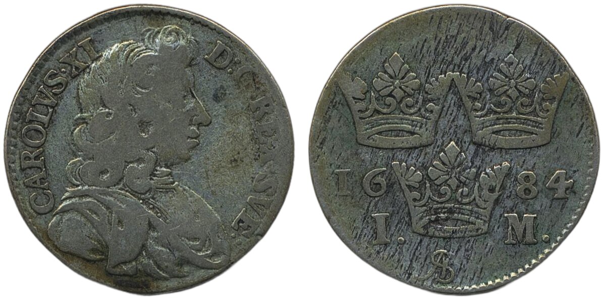 Coins, Sweden. Karl XI, SM 175, 1 mark 1684. 4.84 g. Stockholm. Ex. J Pedersen Mynthandel. RR. SMB 279. 1?/1)(1/1+.