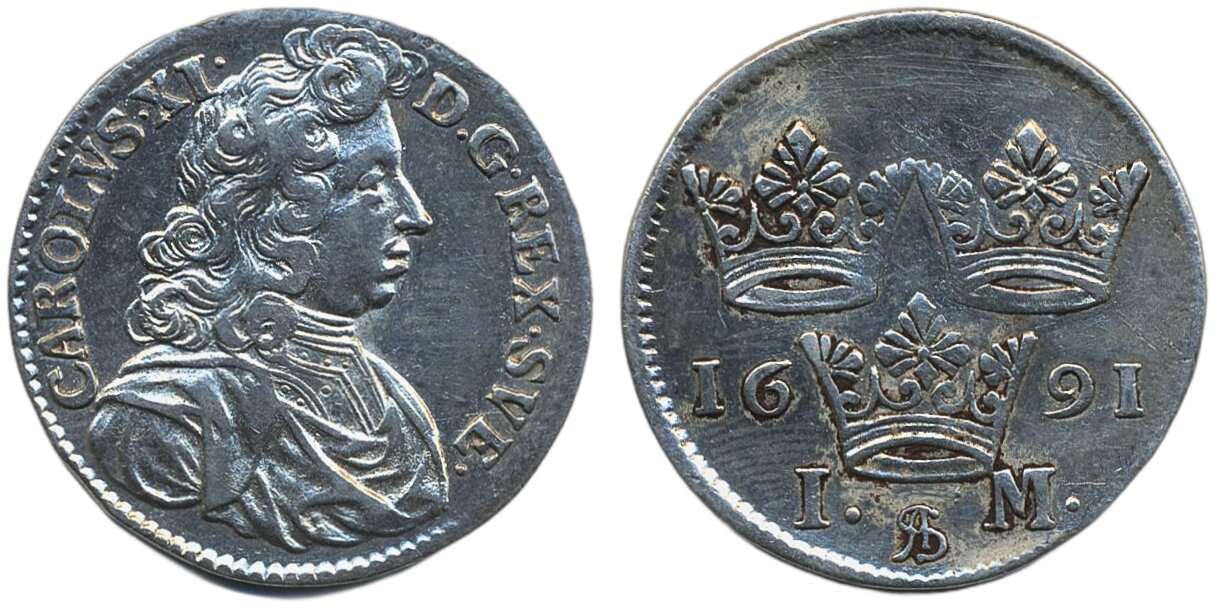 Coins, Sweden. Karl XI, SM 182, 1 mark 1691. Stockholm. Cleaned, reverse faint scratches. SMB 286. Göhle 94. 1+/01.