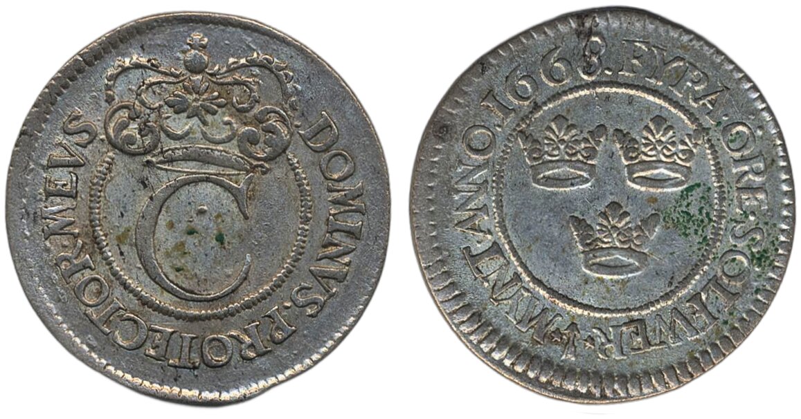 Coins, Sweden. Karl XI, SM 197c, 4 öre 1668. 3.57 g. Stockholm. Minor verdigris. Large 8 in date. Ex. Sten Törngren. SMB 208. Göhle 32. 1+/01.