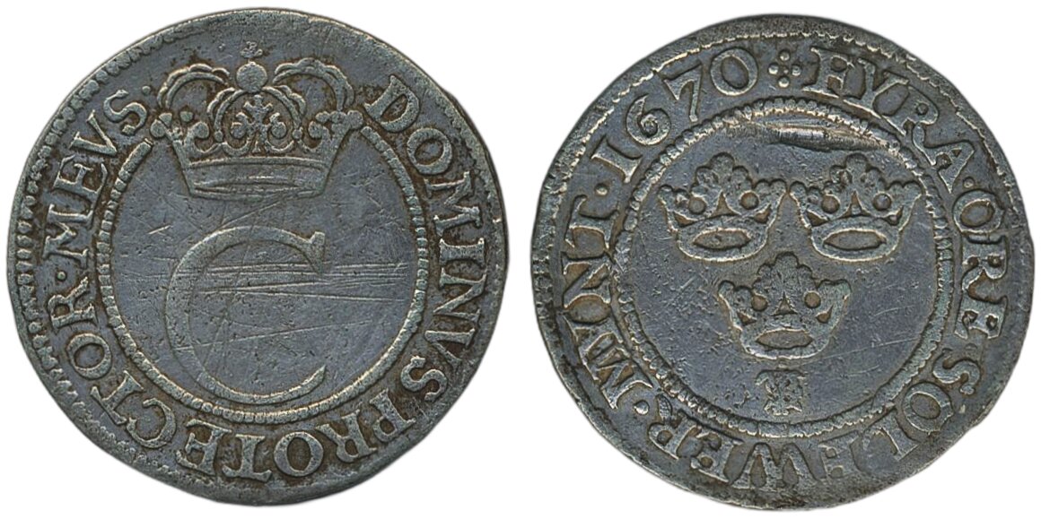Coins, Sweden. Karl XI, SM 199a, 4 öre 1670. 3.27 g. Stockholm. Scratches. More scarce variety with crowns in style of 2 mark. SMB 319. Göhle 175. 1/1+.