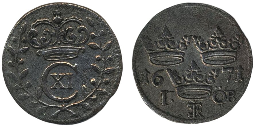 Coins, Sweden. Karl XI, SM 231, 1 öre 1671. 1.29 g. Stockholm. 1+.