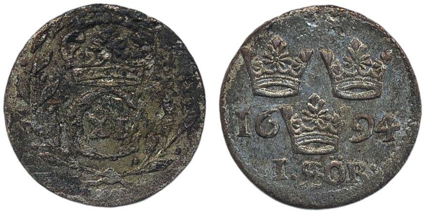 Coins, Sweden. Karl XI, SM 250, 1 öre 1694. 0.99 g. Stockholm. Light corrosion. 1+)(01.