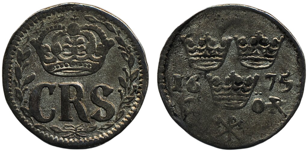 Coins, Sweden. Karl XI, SM 257a, 2 öre 1675. 1.58 g. Landskrona. Sought after type coin. 1/1+.