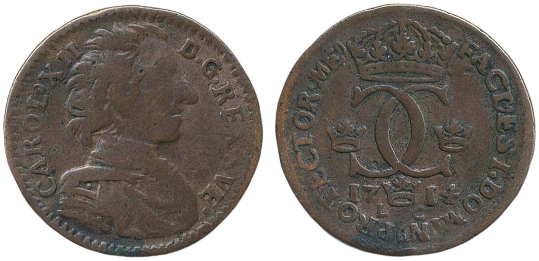 Coins, Sweden. Karl XII, SM 16 var, 1 dukat 1714. 2.74 g. Stockholm. Off-metal strike in copper. Not recorded in literature as far as we can establish. 1/1+.