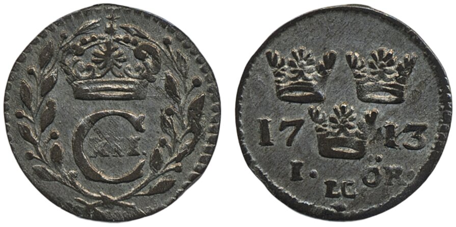 Coins, Sweden. Karl XII, SM 137, 1 öre 1713. 1.17 g. Stockholm. 1+.