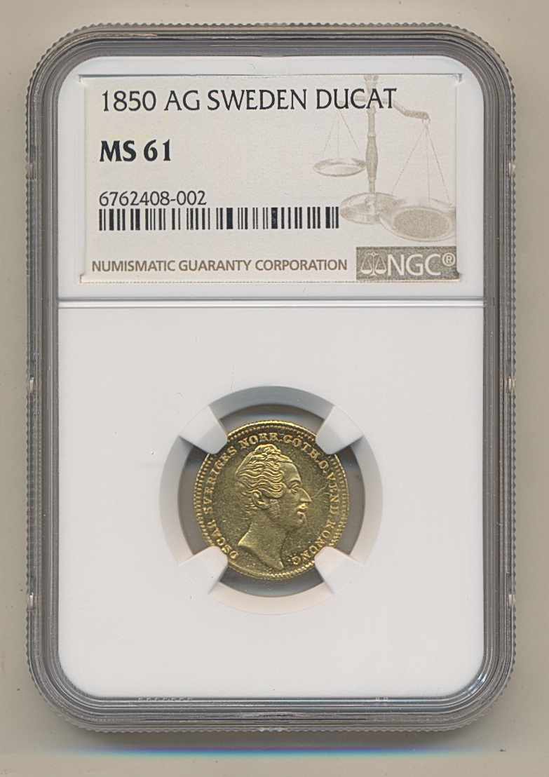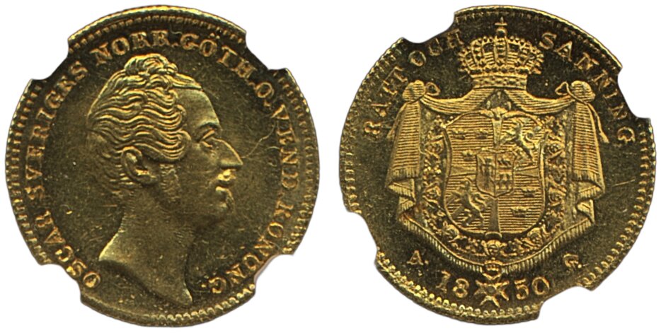 Coins, Sweden. Oskar I, SM 14, 1 dukat 1850. Graded MS61 by NGC. 01. See certification at NGC