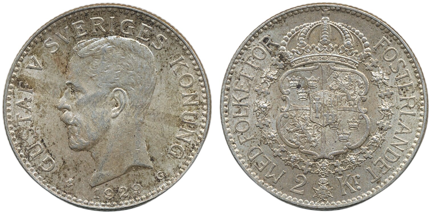 Coins, Sweden. Gustav V, MIS I.11, 2 kronor 1929. 01/0.