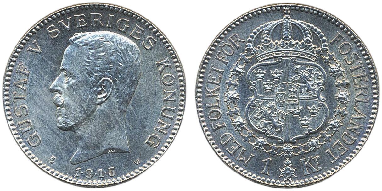 Coins, Sweden. Gustav V, MIS I.5c, 1 krona 1915. 01/0.