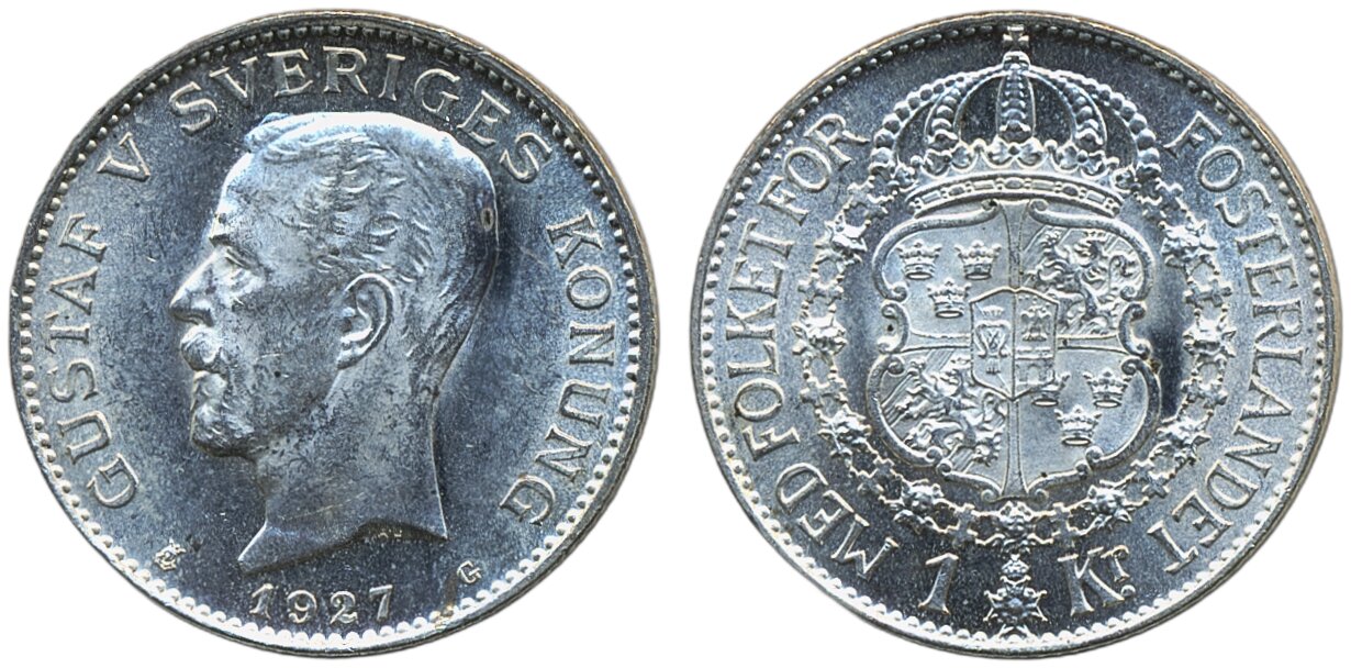 Coins, Sweden. Gustav V, MIS I.13, 1 krona 1927. Only small handling marks and minor spots. 01/0.