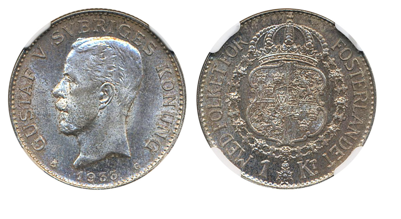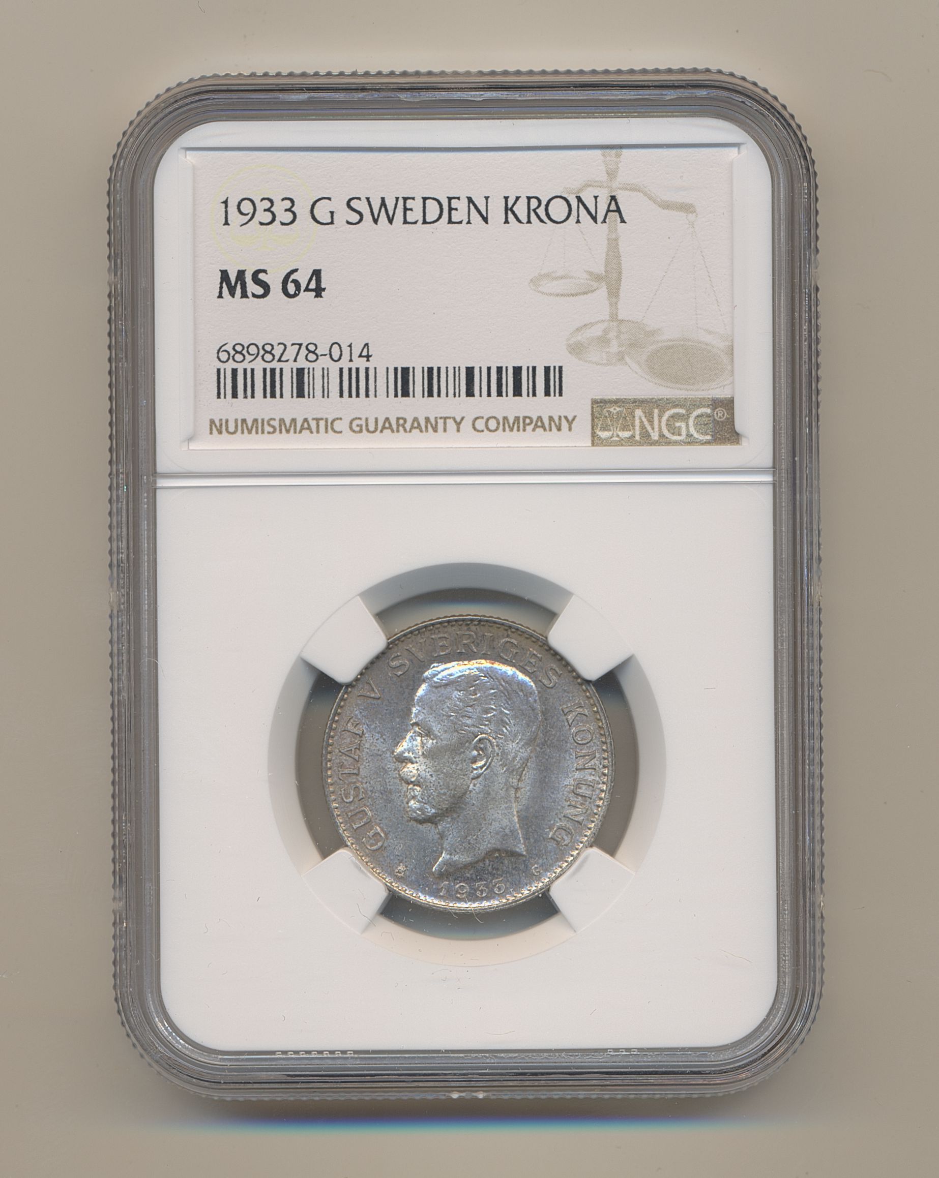 Coins, Sweden. Gustav V, MIS I.19, 1 krona 1933. Graded by NGC as MS64. 01/0. See certification at NGC