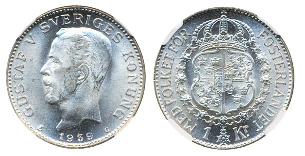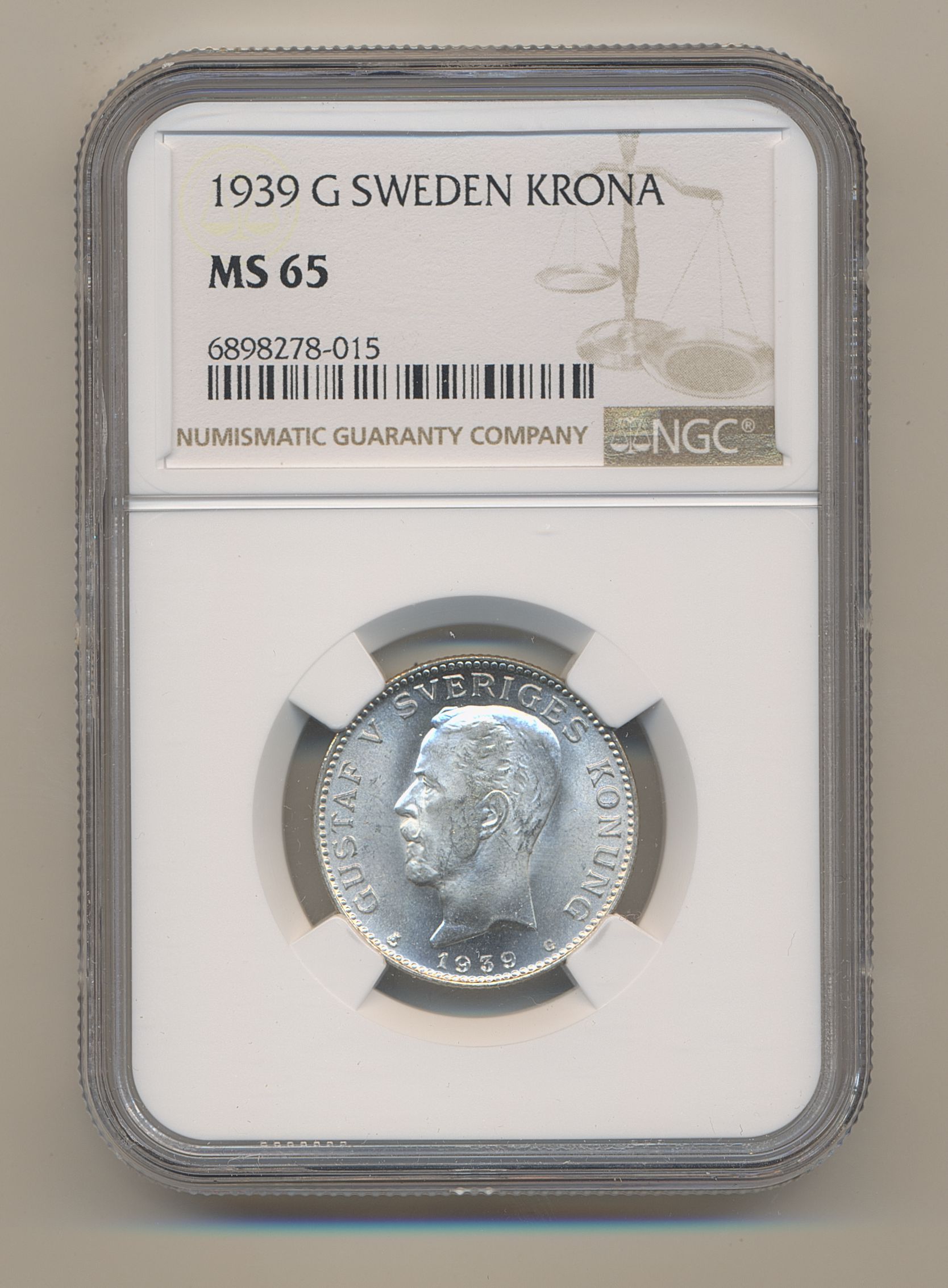 Coins, Sweden. Gustav V, MIS I.25a, 1 krona 1939. Graded by NGC as MS65. 0. See certification at NGC